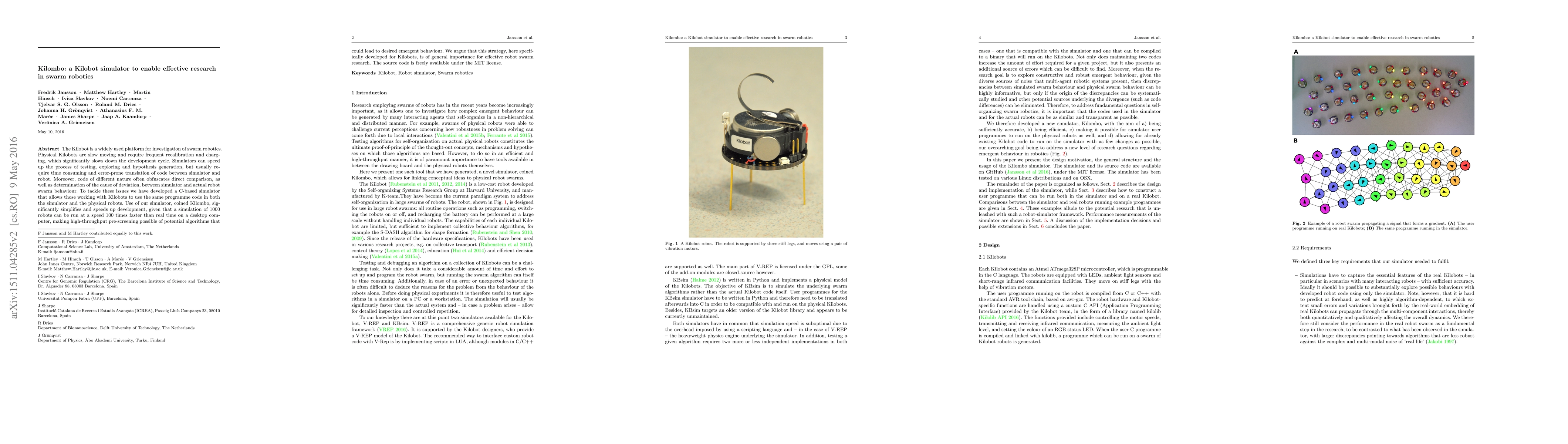 Kilombo is a C-based Kilobot simulator designed to streamline swarm robotics research by enabling the use of identical code for both simulation and physical robots, significantly speeding up development and testing. This simulator facilitates high-throughput pre-screening of algorithms at speeds up to 100 times real time.