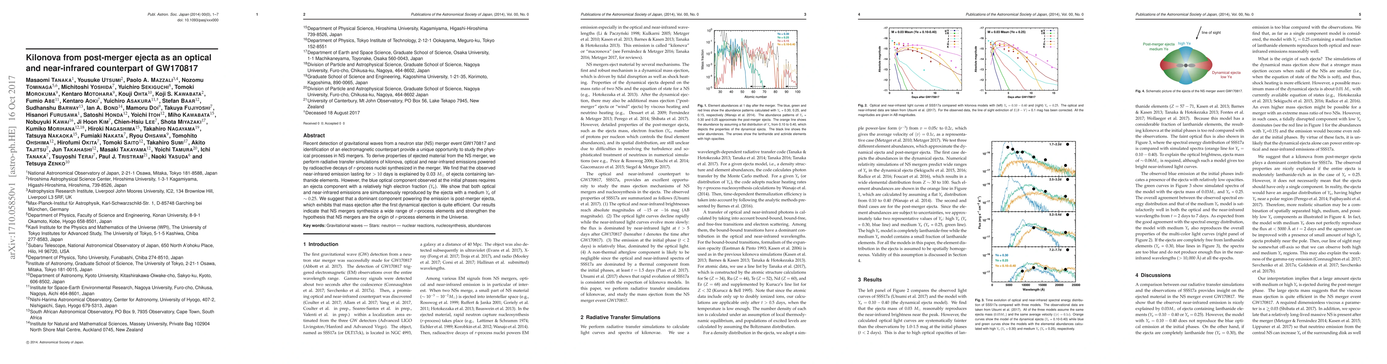 This paper investigates the kilonova following the neutron star merger GW170817, revealing that the observed optical and near-infrared emissions are powered by radioactive decay of r-process nuclei in post-merger ejecta. The study suggests that efficient mass ejection after the initial merger contributes significantly to the kilonova's luminosity.
