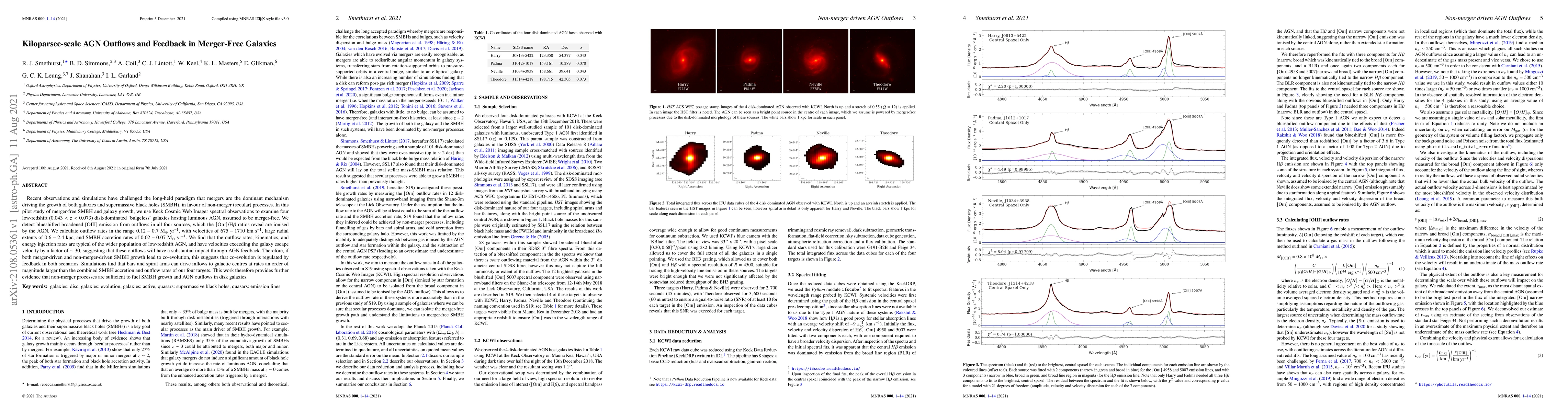 Recent observations and simulations have challenged the long-held paradigm that mergers are the dominant mechanism driving the growth of both galaxies and supermassive black holes (SMBH), in favour of non-merger (secular) processes. In this pilot study of merger-free SMBH and galaxy growth, we use Keck Cosmic Web Imager spectral observations to examine four low-redshift ($0.043 < z < 0.073$) disk-dominated `bulgeless' galaxies hosting luminous AGN, assumed to be merger-free. We detect blueshifted broadened [OIII] emission from outflows in all four sources, which the \oiii/\hbeta~ratios reveal are ionised by the AGN. We calculate outflow rates in the range $0.12-0.7~\rm{M}_{\odot}~\rm{yr}^{-1}$, with velocities of $675-1710~\rm{km}~\rm{s}^{-1}$, large radial extents of $0.6-2.4~\rm{kpc}$, and SMBH accretion rates of $0.02-0.07~\rm{M}_{\odot}~\rm{yr}^{-1}$. We find that the outflow rates, kinematics, and energy injection rates are typical of the wider population of low-redshift AGN, and have velocities exceeding the galaxy escape velocity by a factor of $\sim30$, suggesting that these outflows will have a substantial impact through AGN feedback. Therefore, if both merger-driven and non-merger-driven SMBH growth lead to co-evolution, this suggests that co-evolution is regulated by feedback in both scenarios. Simulations find that bars and spiral arms can drive inflows to galactic centres at rates an order of magnitude larger than the combined SMBH accretion and outflow rates of our four targets. This work therefore provides further evidence that non-merger processes are sufficient to fuel SMBH growth and AGN outflows in disk galaxies.