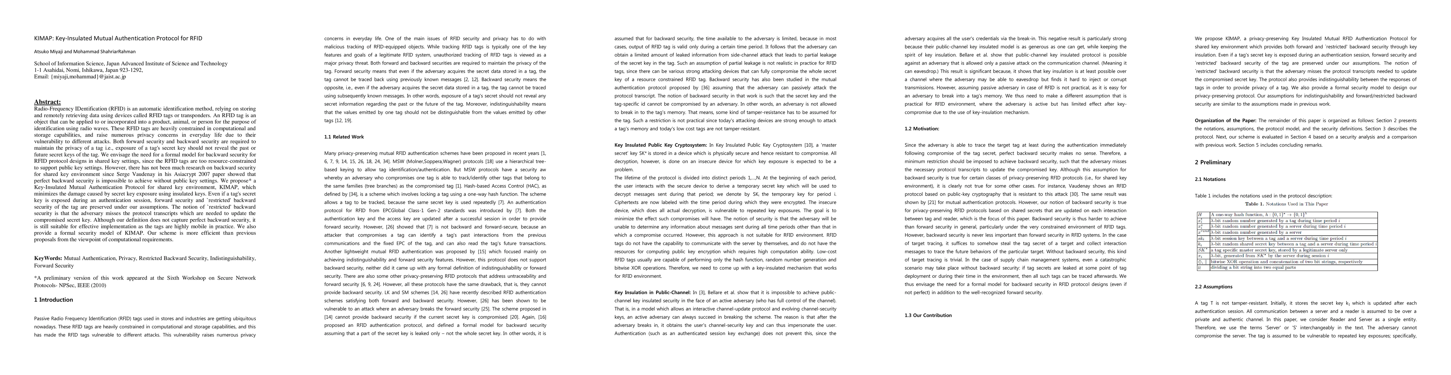 The paper proposes KIMAP, a Key-Insulated Mutual Authentication Protocol for resource-constrained RFID tags, aiming to achieve forward security and `restricted' backward security without relying on public key infrastructures. KIMAP minimizes the impact of secret key exposure using insulated keys, providing a formal security model and demonstrating computational efficiency over previous methods.