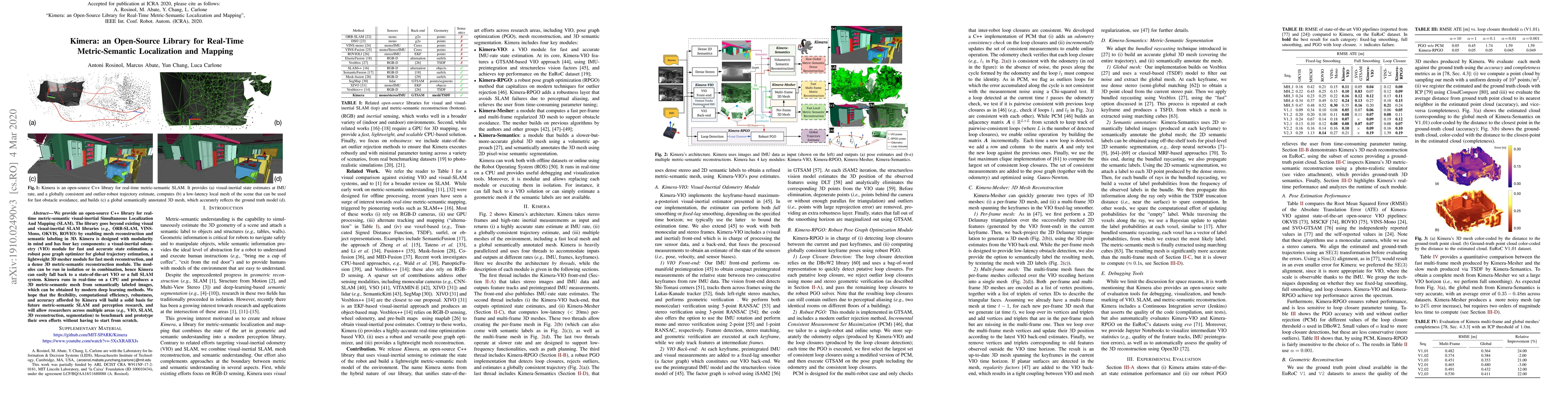 Kimera is an open-source C++ library for real-time metric-semantic visual-inertial SLAM, featuring modularity with components for odometry, pose graph optimization, mesh reconstruction, and dense 3D metric-semantic mapping. It aims to facilitate future research in SLAM and perception by providing a robust, flexible, and efficient toolset.