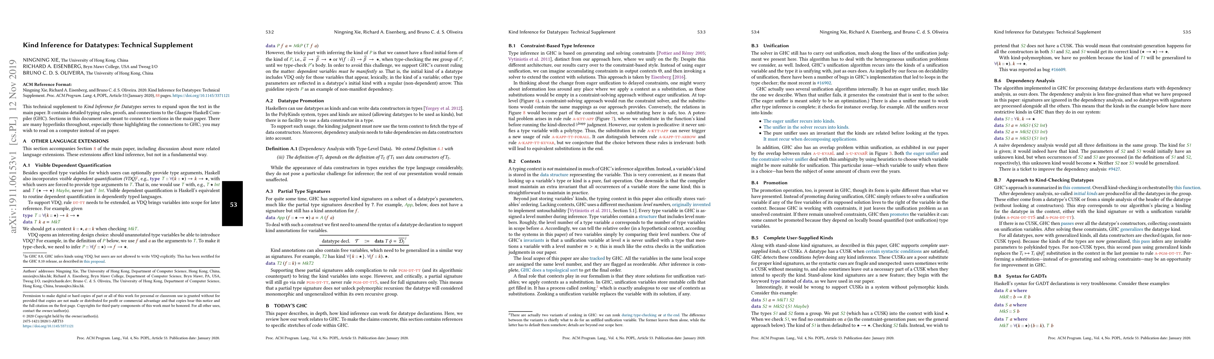 This technical supplement elaborates on the main paper's study of kind inference for datatypes in Haskell, providing detailed typing rules, proofs, and connections to the Glasgow Haskell Compiler (GHC). It complements the declarative specifications for Haskell98 and PolyKinds, focusing on soundness, completeness, and principal kinds.