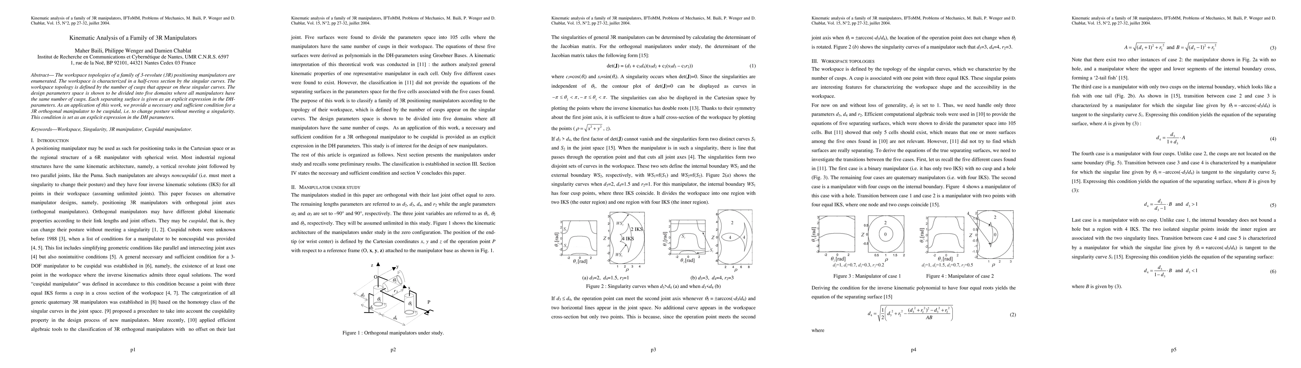 Researchers analyzed 3R manipulators to identify workspace topologies and cusps, finding that design parameters create distinct domains with the same number of cusps. A necessary condition for a non-cuspidal manipulator is provided in terms of DH-parameters.