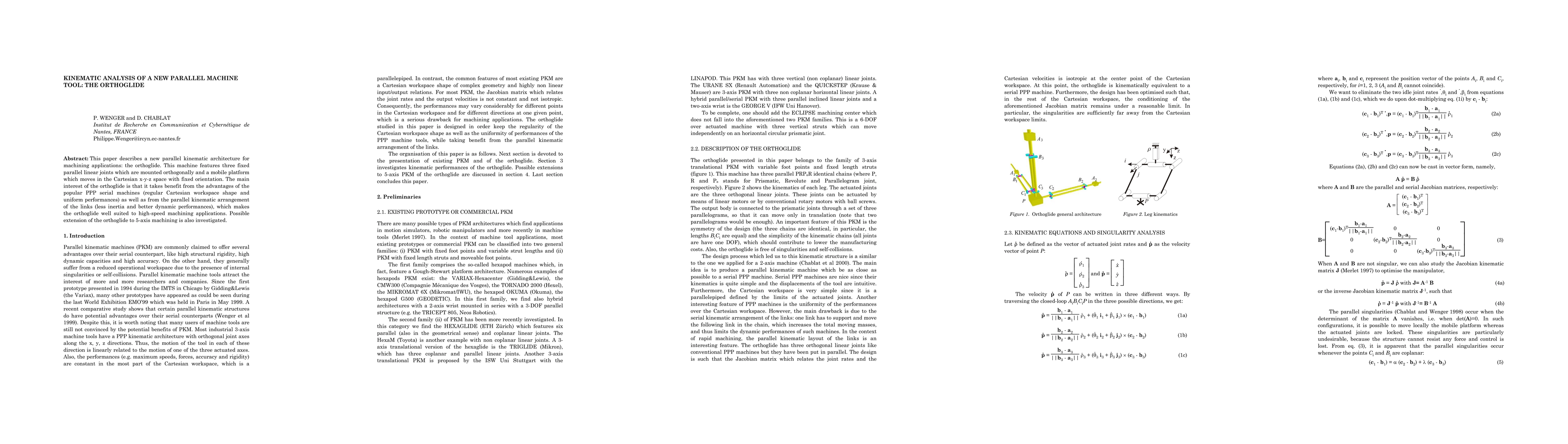 This paper introduces the orthoglide, a novel parallel kinematic machine tool with three fixed orthogonal linear joints and a mobile platform, combining the benefits of PPP serial machines and parallel kinematics for high-speed machining applications. The study also explores its potential for 5-axis machining.