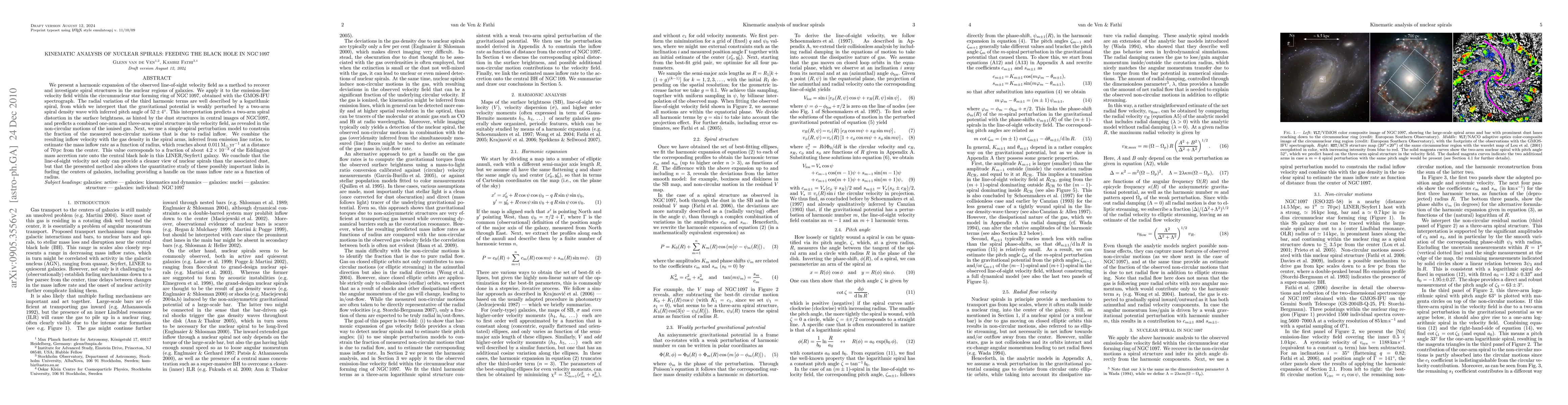 We present a harmonic expansion of the observed line-of-sight velocity field as a method to recover and investigate spiral structures in the nuclear regions of galaxies. We apply it to the emission-line velocity field within the circumnuclear starforming ring of NGC1097, obtained with the GMOS-IFU spectrograph. The radial variation of the third harmonic terms are well described by a logarithmic spiral, from which we interpret that the gravitational potential is weakly perturbed by a two-arm spiral density wave with inferred pitch angle of of 52+/-4 degrees. This interpretation predicts a two-arm spiral distortion in the surface brightness, as hinted by the dust structures in central images of NGC1097, and predicts a combined one-arm and three-arm spiral structure in the velocity field, as revealed in the non-circular motions of the ionised gas within the circumnuclear region of this galaxy. Next, we use a simple spiral perturbation model to constrain the fraction of the measured non-circular motions that is due to radial inflow. We combine the resulting inflow velocity with the gas density in the spiral arms, inferred from emission line ratios, to estimate the mass inflow rate as a function of radius, which reaches about 0.011 Msun/yr at a distance of 70 pc from the center. This value corresponds to a fraction of about 4.2 x 10^{-3} of the Eddington mass accretion rate onto the central black hole in this LINER/Seyfert1 galaxy. We conclude that the line-of-sight velocity not only can provide a cleaner view of nuclear spirals than the associated dust, but that the presented method also allows the quantitative study of these possibly important links in fueling the centers of galaxies, including providing a handle on the mass inflow rate as a function of radius.