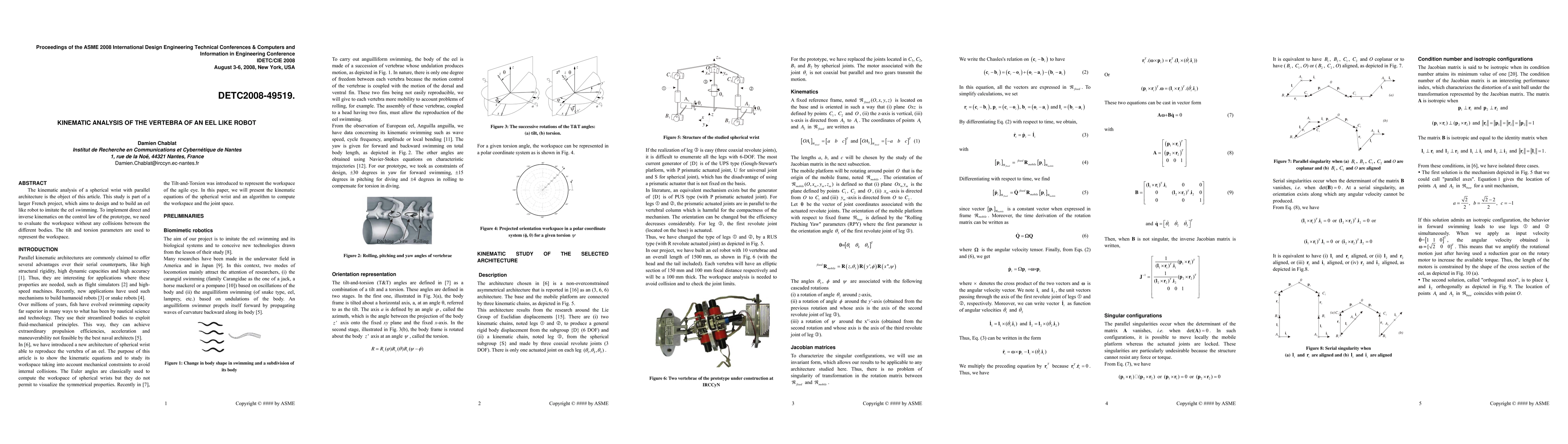 This paper conducts a kinematic analysis of a spherical wrist in a parallel architecture for an eel-like robot, aiming to evaluate its workspace to avoid collisions. The study focuses on tilt and torsion parameters to represent the robot's operational space.