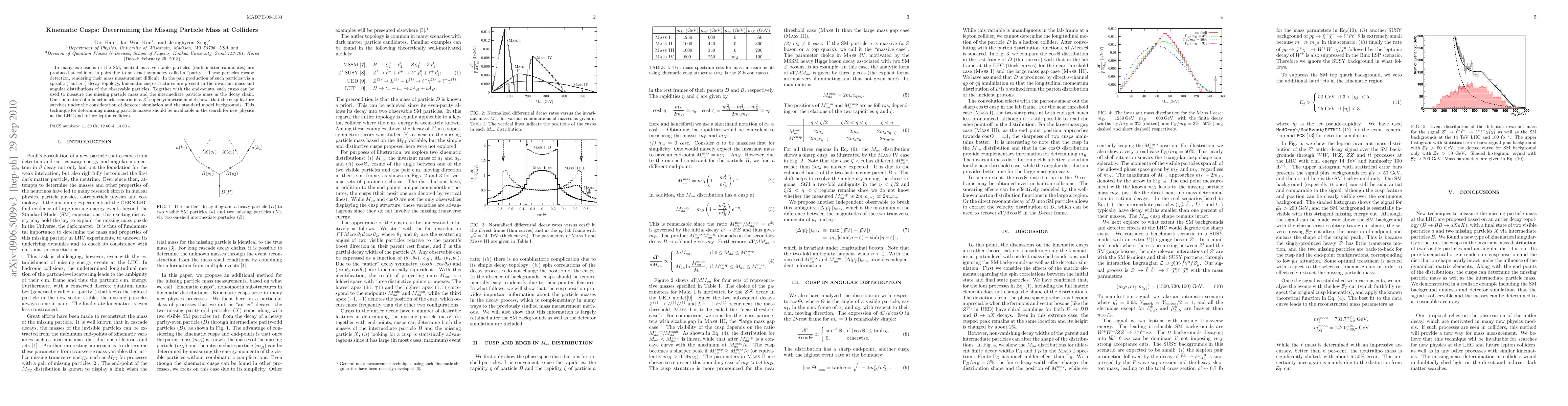 In many extensions of the SM, neutral massive stable particles (dark matter candidates) are produced at colliders in pairs due to an exact symmetry called a "parity". These particles escape detection, rendering their mass measurement difficult. In the pair production of such particles via a specific ("antler") decay topology, kinematic cusp structures are present in the invariant mass and angular distributions of the observable particles. Together with the end-points, such cusps can be used to measure the missing particle mass and the intermediate particle mass in the decay chain. Our simulation of a benchmark scenario in a Z' supersymmetric model shows that the cusp feature survives under the consideration of detector simulation and the standard model backgrounds. This technique for determining missing particle masses should be invaluable in the search for new physics at the LHC and future lepton colliders.