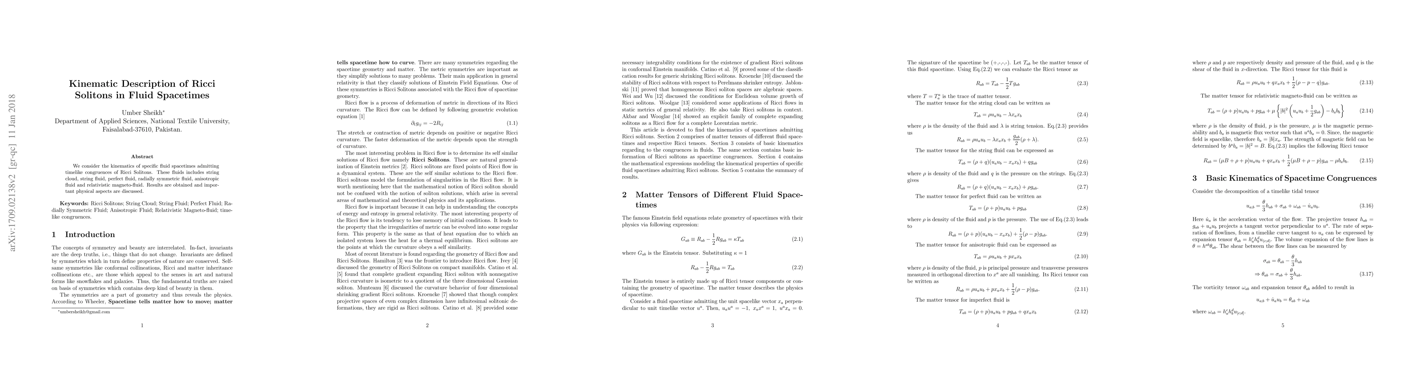 Detailed kinematic description and conditions for Ricci Solitons in various fluid spacetimes, providing a comprehensive set of theorems and equations.