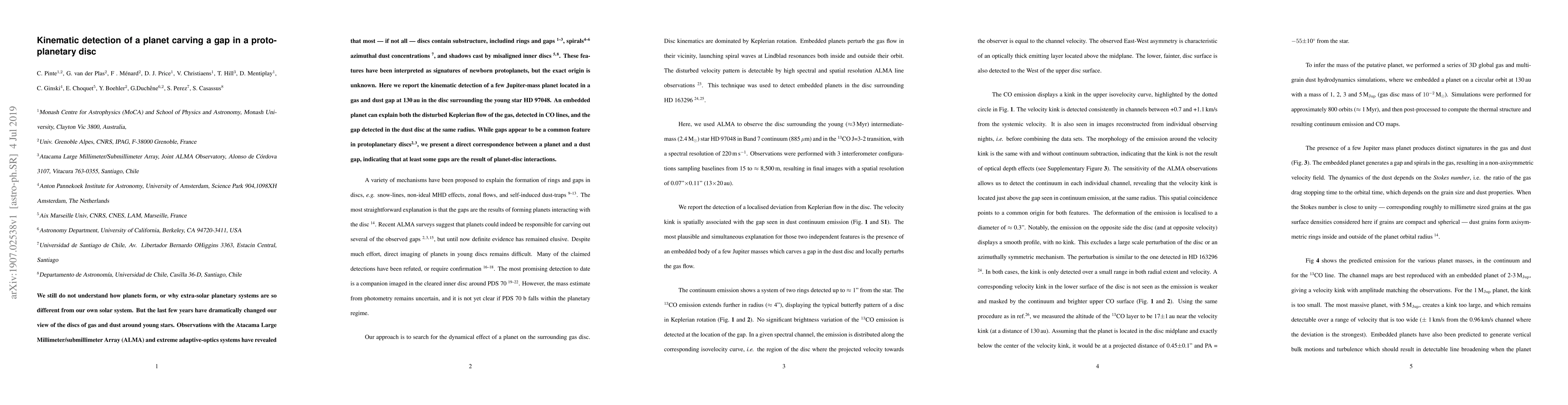 This paper reports the kinematic detection of a Jupiter-mass planet carving a gap in the protoplanetary disc around the star HD 97048, using ALMA and adaptive optics. The planet's presence explains both the disturbed gas flow and the dust gap, suggesting that planet-disc interactions can create such features.