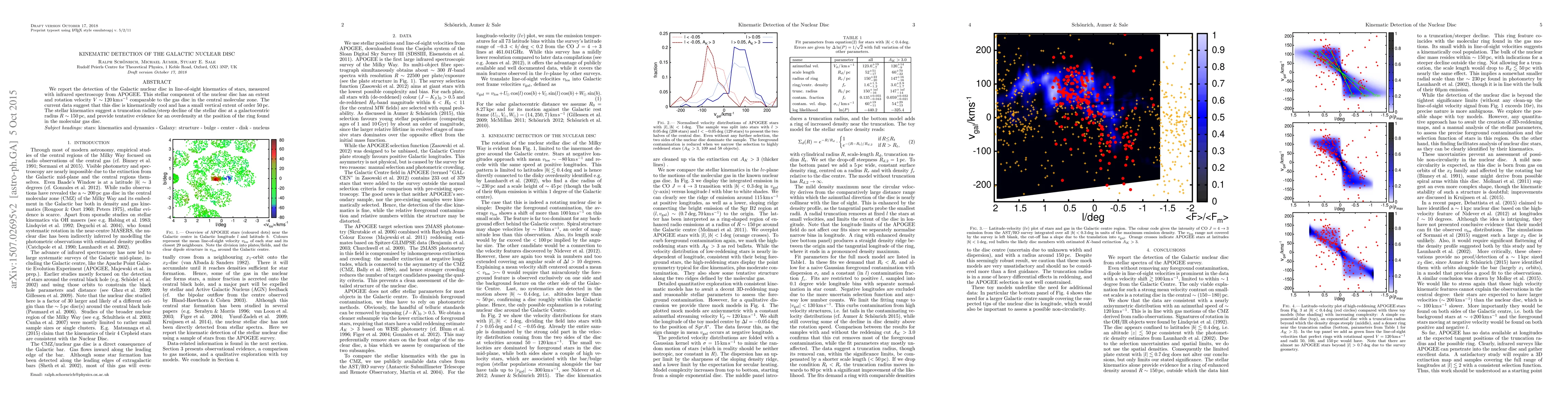 We report the detection of the Galactic nuclear disc in line-of-sight kinematics of stars, measured with infrared spectroscopy from APOGEE. This stellar component of the nuclear disc has an extent and rotation velocity V ~ 120kms comparable to the gas disc in the central molecular zone. The current data suggest that this disc is kinematically cool and has a small vertical extent of order 50pc. The stellar kinematics suggest a truncation radius/steep decline of the stellar disc at a galactocentric radius R ~ 150pc, and provide tentative evidence for an overdensity at the position of the ring found in the molecular gas disc.