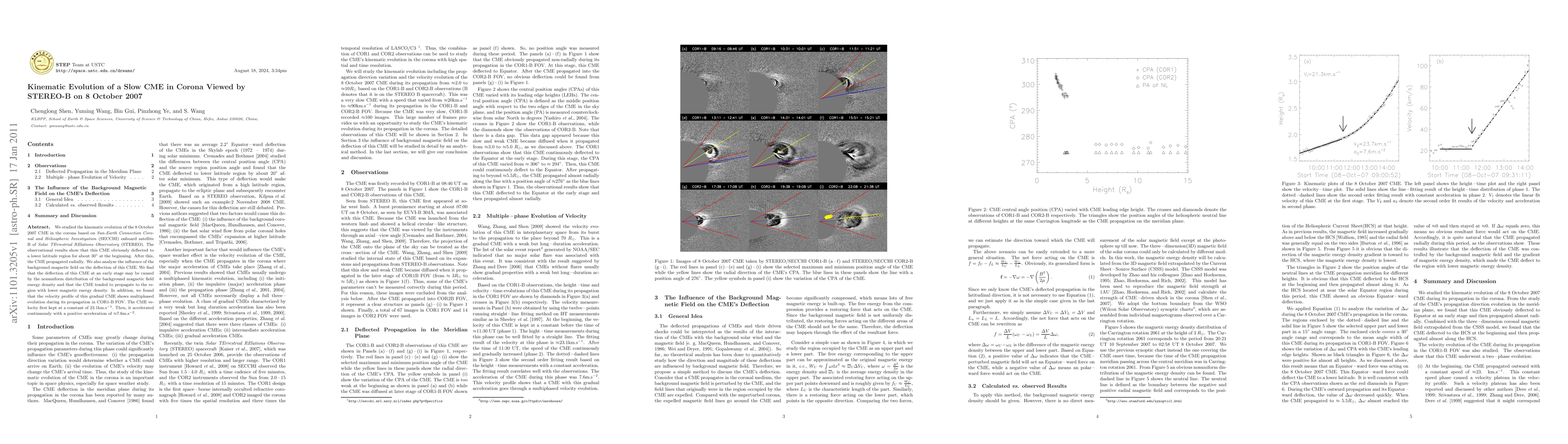 We studied the kinematic evolution of the 8 October 2007 CME in the corona based on Sun-Earth Connection Coronal and Heliospheric Investigation (SECCHI) onboard satellite B of Solar TErrestrial RElations Observatory (STEREO). The observational results show that this CME obviously deflected to a lower latitude region for about 30$^\circ$ at the beginning. After this, the CME propagated radially. We also analyze the influence of the background magnetic field on the deflection of this CME. We find that the deflection of this CME at an early stage may be caused by the nonuniform distribution of the background magnetic field energy density and that the CME tended to propagate to the region with lower magnetic energy density. In addition, we found that the velocity profile of this gradual CME shows multiphased evolution during its propagation in COR1-B FOV. The CME velocity first kept at a constant of 23.1km.s-1. Then, it accelerated continuously with a positive acceleration of 7.6m.s-2.
