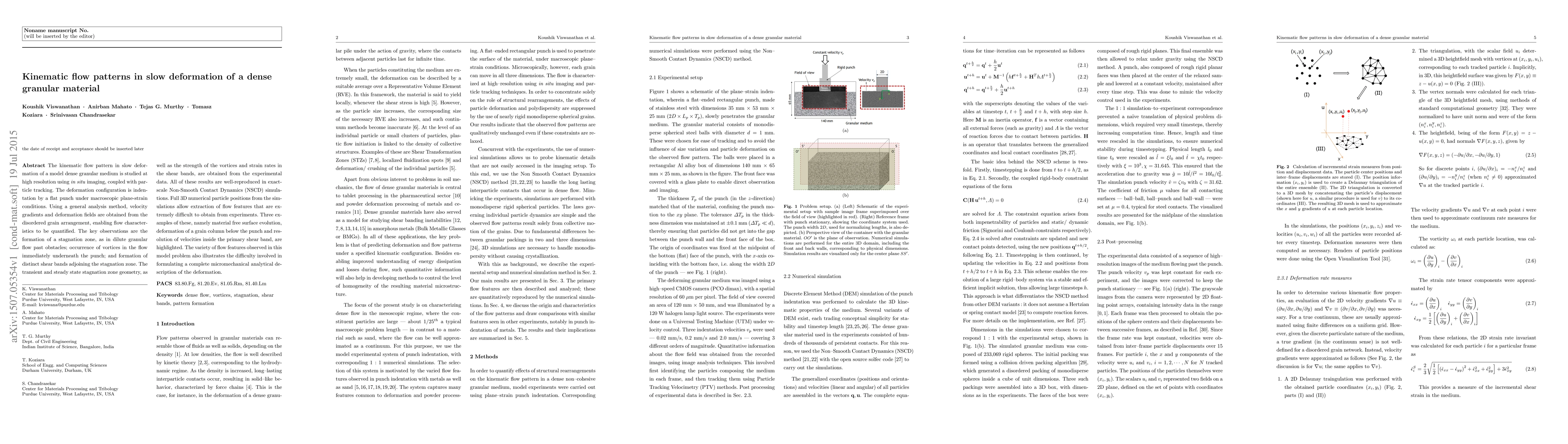 This study investigates the kinematic flow patterns in slow deformation of dense granular materials using high-resolution \emph{in situ} imaging and particle tracking during indentation by a flat punch. The research identifies key flow features such as stagnation zones, vortices, and shear bands, and validates these observations with Non-Smooth Contact Dynamics simulations, highlighting the complexity of micromechanical analytical descriptions.