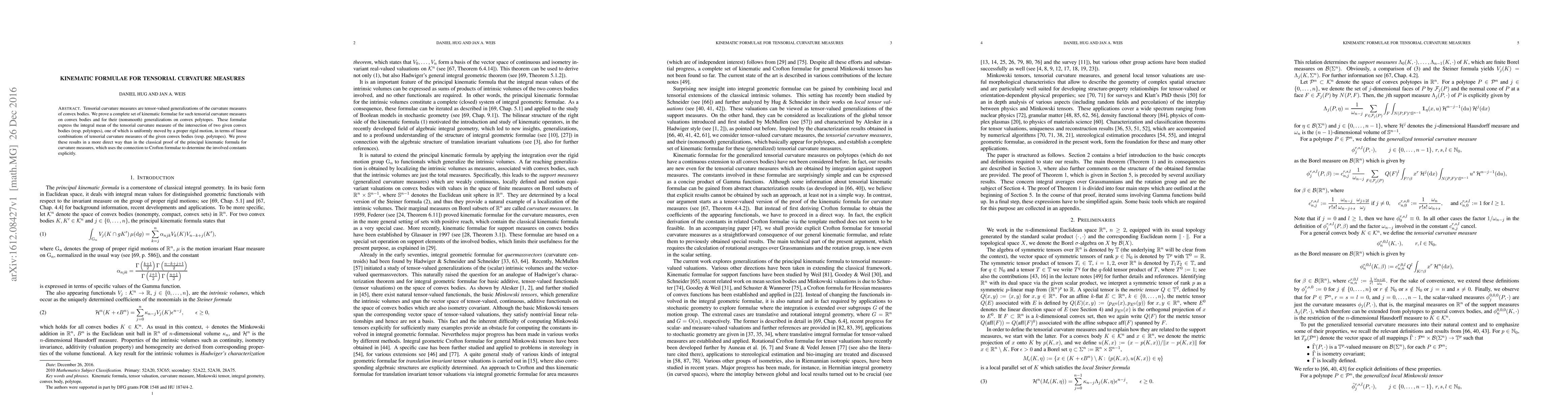 Tensorial curvature measures are tensor-valued generalizations of the curvature measures of convex bodies. We prove a complete set of kinematic formulae for such tensorial curvature measures on convex bodies and for their (nonsmooth) generalizations on convex polytopes. These formulae express the integral mean of the tensorial curvature measure of the intersection of two given convex bodies (resp.~polytopes), one of which is uniformly moved by a proper rigid motion, in terms of linear combinations of tensorial curvature measures of the given convex bodies (resp.~polytopes). We prove these results in a more direct way than in the classical proof of the principal kinematic formula for curvature measures, which uses the connection to Crofton formulae to determine the involved constants explicitly.