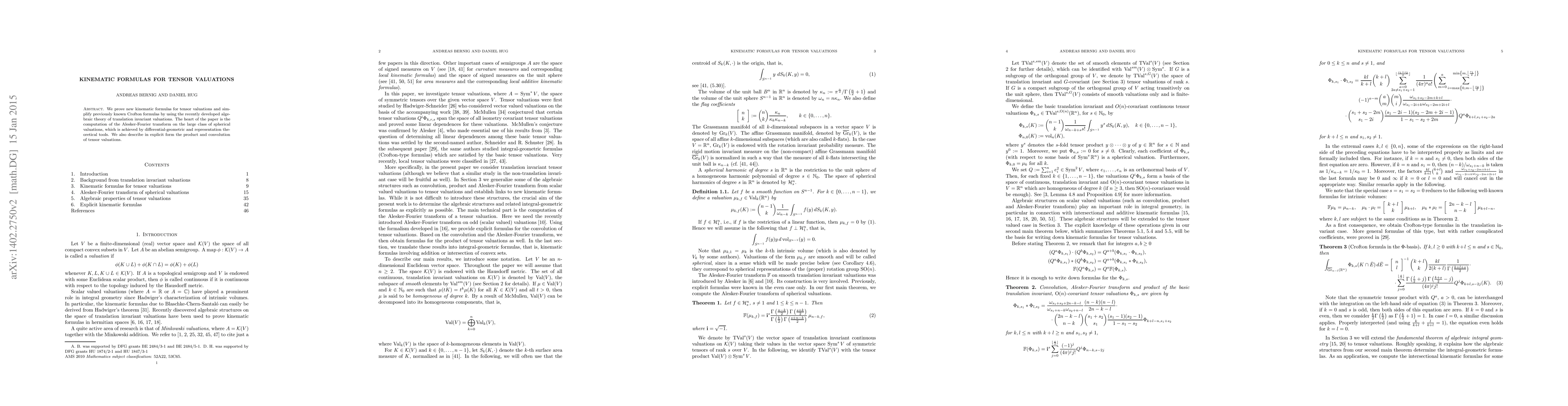 This paper establishes new kinematic formulas for tensor valuations and simplifies existing Crofton formulas using algebraic theory. It also computes the Alesker-Fourier transform on spherical valuations through differential geometry and representation theory, and explicitly describes the product and convolution of tensor valuations.