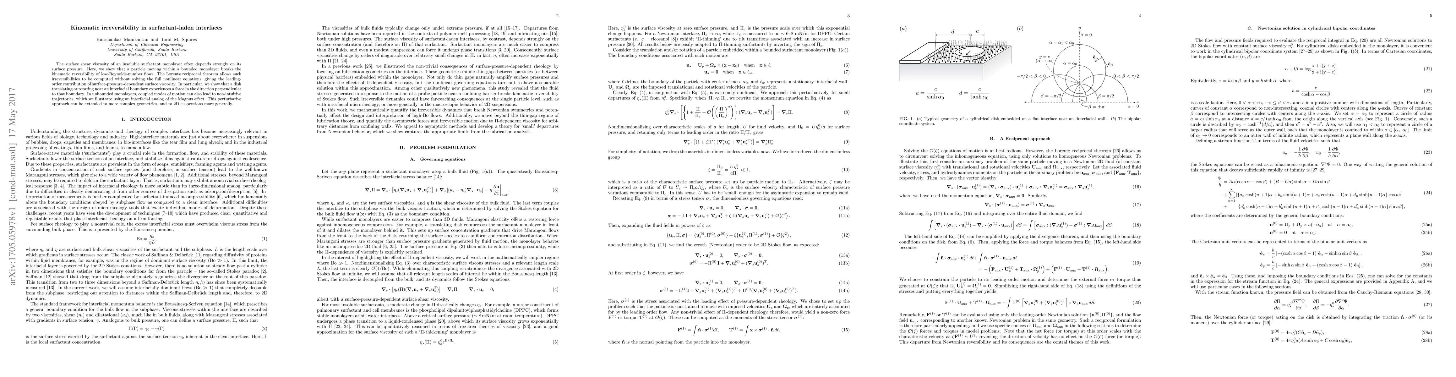 The surface shear viscosity of an insoluble surfactant monolayer often depends strongly on its surface pressure. Here, we show that a particle moving within a bounded monolayer breaks the kinematic reversibility of low-Reynolds-number flows. The Lorentz reciprocal theorem allows such irreversibilities to be computed without solving the full nonlinear equations, giving the leading-order contribution of surface-pressure-dependent surface viscosity. In particular, we show that a disk translating or rotating near an interfacial boundary experiences a force in the direction perpendicular to that boundary. In unbounded monolayers, coupled modes of motion can also lead to non-intuitive trajectories, which we illustrate using an interfacial analog of the Magnus effect. This perturbative approach can be extended to more complex geometries, and to 2D suspensions more generally.