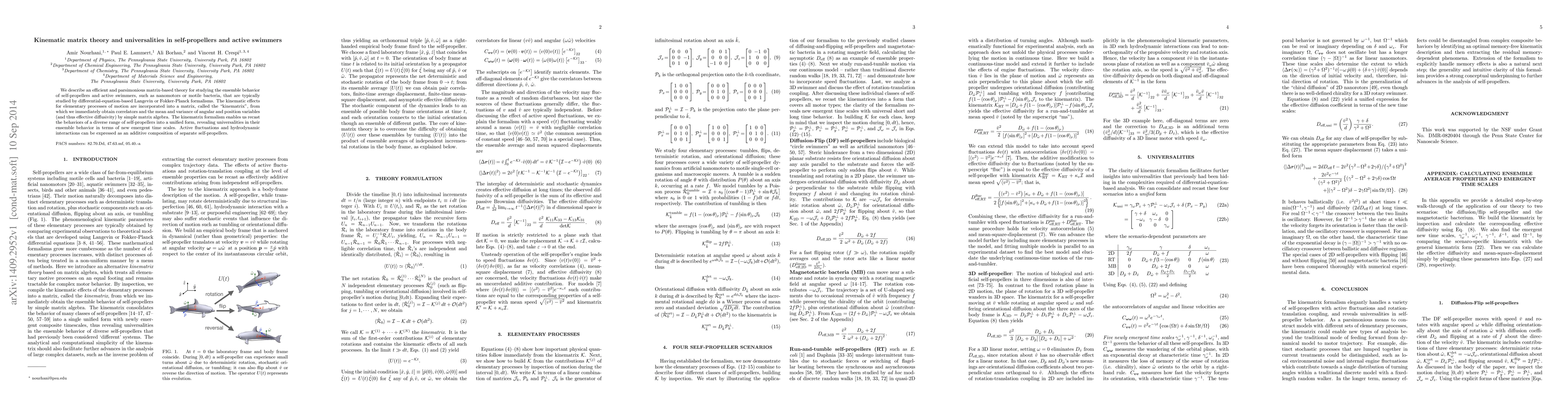 We describe an efficient and parsimonious matrix-based theory for studying the ensemble behavior of self-propellers and active swimmers, such as nanomotors or motile bacteria, that are typically studied by differential-equation-based Langevin or Fokker-Planck formalisms. The kinematic effects for elementary processes of motion are incorporated into a matrix, called the "kinematrix", from which we immediately obtain correlators and the mean and variance of angular and position variables (and thus effective diffusivity) by simple matrix algebra. The kinematrix formalism enables us recast the behaviors of a diverse range of self-propellers into a unified form, revealing universalities in their ensemble behavior in terms of new emergent time scales. Active fluctuations and hydrodynamic interactions can be expressed as an additive composition of separate self-propellers.