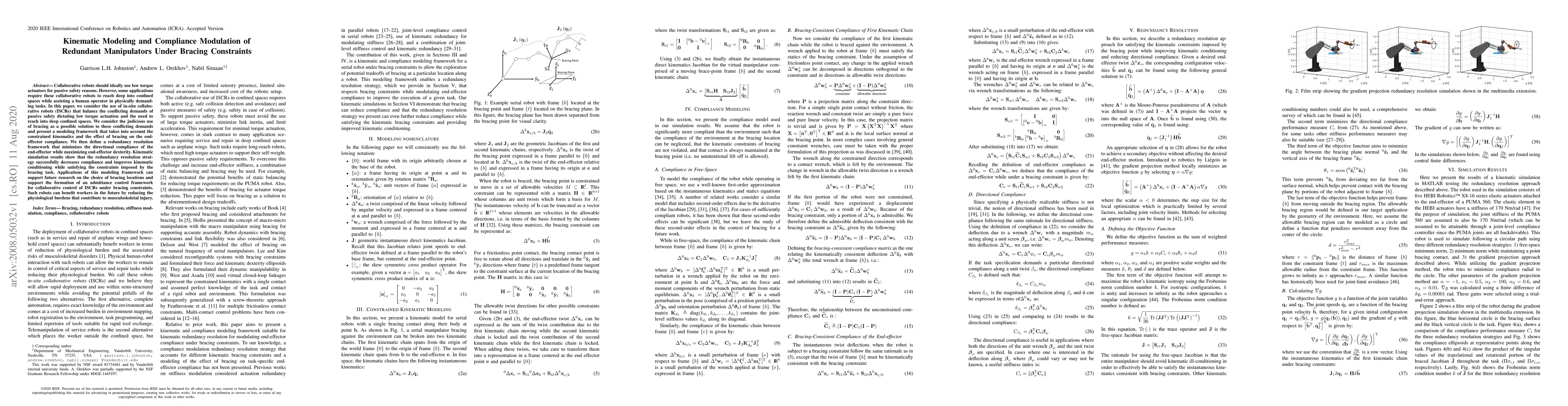 Collaborative robots should ideally use low torque actuators for passive safety reasons. However, some applications require these collaborative robots to reach deep into confined spaces while assisting a human operator in physically demanding tasks. In this paper, we consider the use of in-situ collaborative robots (ISCRs) that balance the conflicting demands of passive safety dictating low torque actuation and the need to reach into deep confined spaces. We consider the judicious use of bracing as a possible solution to these conflicting demands and present a modeling framework that takes into account the constrained kinematics and the effect of bracing on the end-effector compliance. We then define a redundancy resolution framework that minimizes the directional compliance of the end-effector while maximizing end-effector dexterity. Kinematic simulation results show that the redundancy resolution strategy successfully decreases compliance and improves kinematic conditioning while satisfying the constraints imposed by the bracing task. Applications of this modeling framework can support future research on the choice of bracing locations and support the formation of an admittance control framework for collaborative control of ISCRs under bracing constraints. Such robots can benefit workers in the future by reducing the physiological burdens that contribute to musculoskeletal injury.