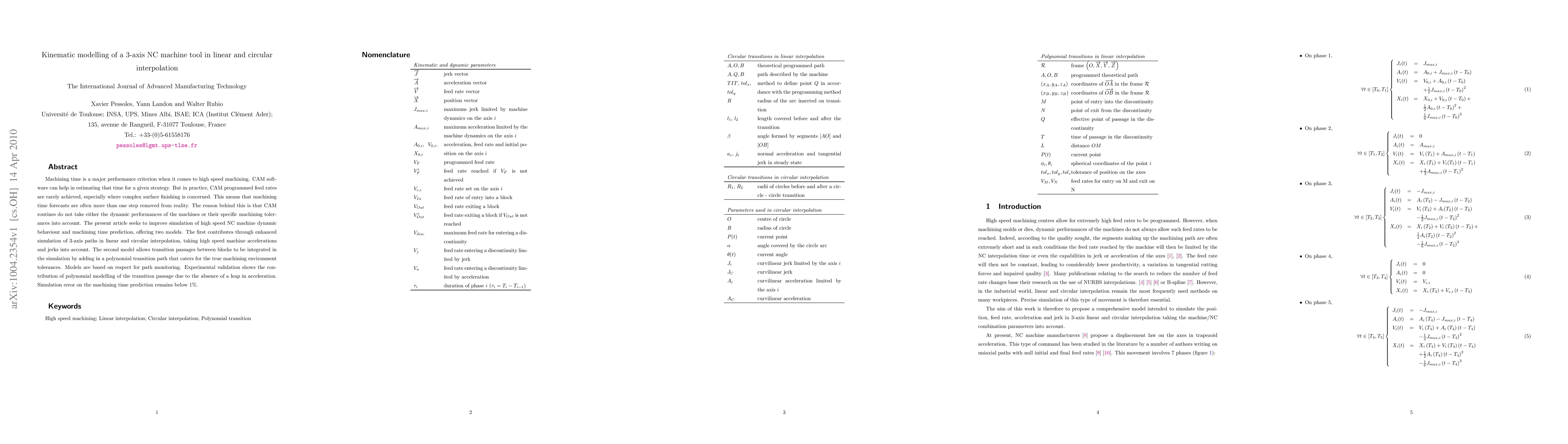 Machining time is a major performance criterion when it comes to high-speed machining. CAM software can help in estimating that time for a given strategy. But in practice, CAM-programmed feed rates are rarely achieved, especially where complex surface finishing is concerned. This means that machining time forecasts are often more than one step removed from reality. The reason behind this is that CAM routines do not take either the dynamic performances of the machines or their specific machining tolerances into account. The present article seeks to improve simulation of high-speed NC machine dynamic behaviour and machining time prediction, offering two models. The first contributes through enhanced simulation of three-axis paths in linear and circular interpolation, taking high-speed machine accelerations and jerks into account. The second model allows transition passages between blocks to be integrated in the simulation by adding in a polynomial transition path that caters for the true machining environment tolerances. Models are based on respect for path monitoring. Experimental validation shows the contribution of polynomial modelling of the transition passage due to the absence of a leap in acceleration. Simulation error on the machining time prediction remains below 1%.