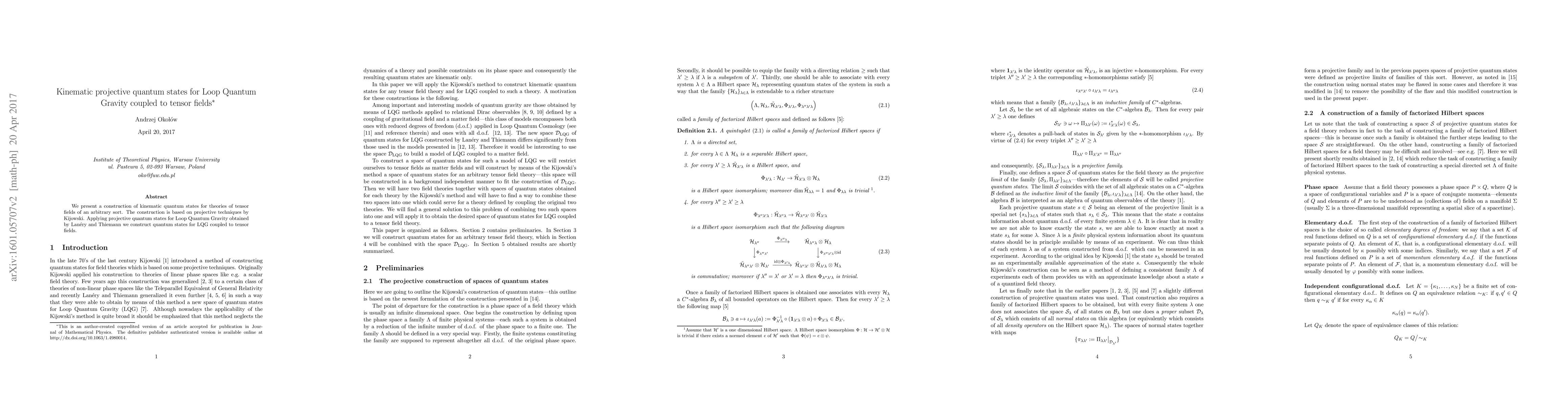 We present a construction of kinematic quantum states for theories of tensor fields of an arbitrary sort. The construction is based on projective techniques by Kijowski. Applying projective quantum states for Loop Quantum Gravity obtained by Lanery and Thiemann we construct quantum states for LQG coupled to tensor fields.