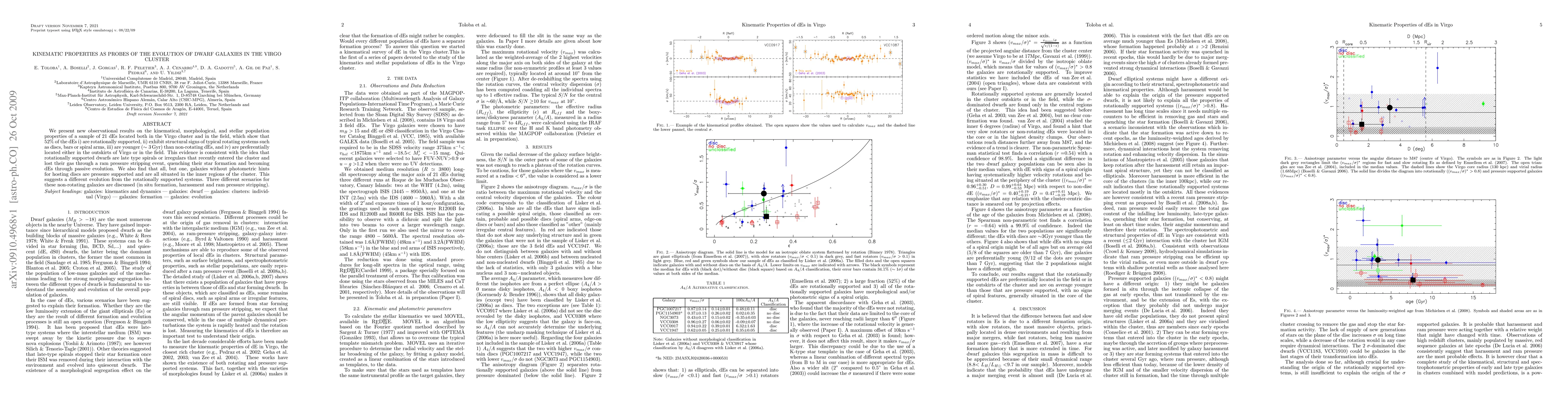 We present new observational results on the kinematical, morphological, and stellar population properties of a sample of 21 dEs located both in the Virgo cluster and in the field, which show that 52% of the dEs i) are rotationally supported, ii) exhibit structural signs of typical rotating systems such as discs, bars or spiral arms, iii) are younger (~3 Gyr) than non-rotating dEs, and iv) are preferentially located either in the outskirts of Virgo or in the field. This evidence is consistent with the idea that rotationally supported dwarfs are late type spirals or irregulars that recently entered the cluster and lost their gas through a ram pressure stripping event, quenching their star formation and becoming dEs through passive evolution. We also find that all, but one, galaxies without photometric hints for hosting discs are pressure supported and are all situated in the inner regions of the cluster. This suggests a different evolution from the rotationally supported systems. Three different scenarios for these non-rotating galaxies are discussed (in situ formation, harassment and ram pressure stripping).