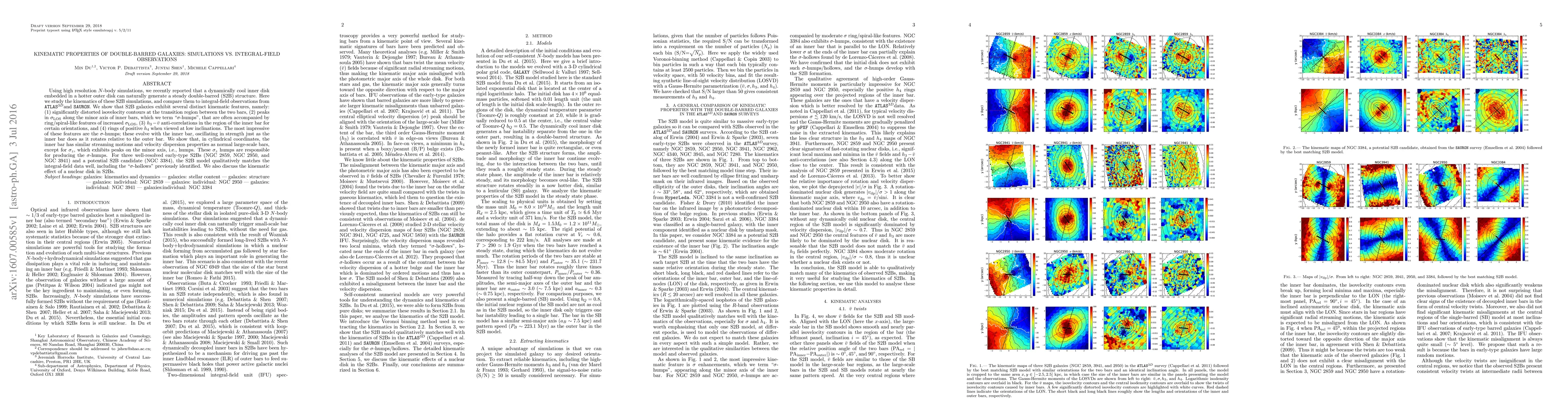 Using high resolution $N$-body simulations, we recently reported that a dynamically cool inner disk embedded in a hotter outer disk can naturally generate a steady double-barred (S2B) structure. Here we study the kinematics of these S2B simulations, and compare them to integral-field observations from ATLAS$^{3D}$ and SAURON. We show that S2B galaxies exhibit several distinct kinematic features, namely: (1) significantly distorted isovelocity contours at the transition region between the two bars, (2) peaks in $\sigma_\mathrm{LOS}$ along the minor axis of inner bars, which we term "$\sigma$-humps", that are often accompanied by ring/spiral-like features of increased $\sigma_\mathrm{LOS}$, (3) $h_3-\bar{v}$ anti-correlations in the region of the inner bar for certain orientations, and (4) rings of positive $h_4$ when viewed at low inclinations. The most impressive of these features are the $\sigma$-humps, these evolve with the inner bar, oscillating in strength just as the inner bar does as it rotates relative to the outer bar. We show that, in cylindrical coordinates, the inner bar has similar streaming motions and velocity dispersion properties as normal large-scale bars, except for $\sigma_z$, which exhibits peaks on the minor axis, i.e., humps. These $\sigma_z$ humps are responsible for producing the $\sigma$-humps. For three well-resolved early-type S2Bs (NGC 2859, NGC 2950, and NGC 3941) and a potential S2B candidate (NGC 3384), the S2B model qualitatively matches the integral-field data well, including the "$\sigma$-hollows" previously identified. We also discuss the kinematic effect of a nuclear disk in S2Bs.