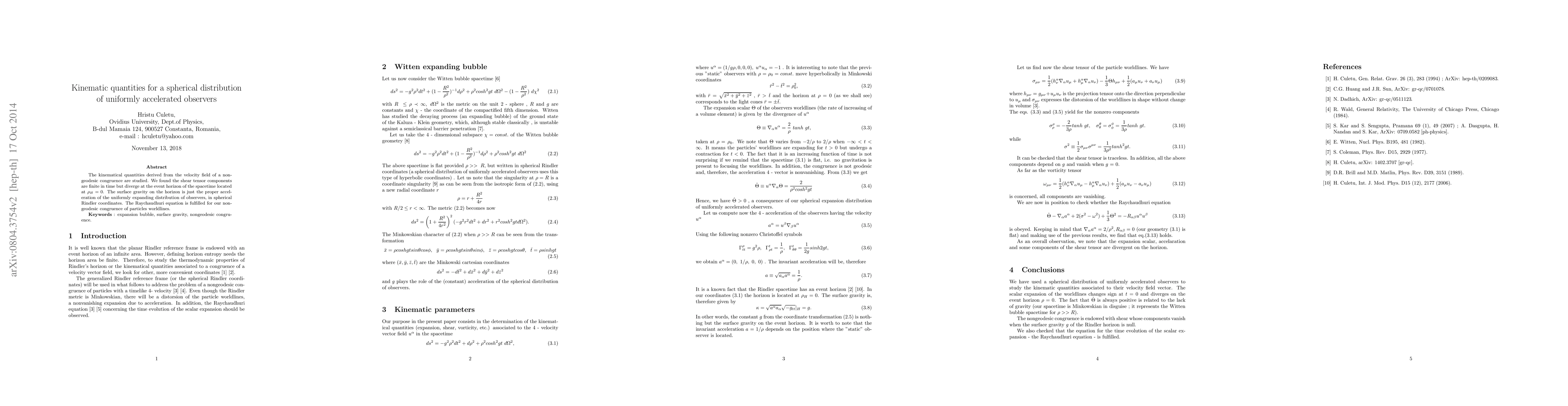 The kinematical quantities derived from the velocity field of a nongeodesic congruence are studied. We found the shear tensor components are finite in time but diverge at the event horizon of the spacetime located at $\rho = 0$. The surface gravity on the horizon is just the proper acceleration of the uniformly expanding distribution of observers, in spherical Rindler coordinates. The Raychaudhuri equation is fulfilled for the congruence of particles worldlines.
