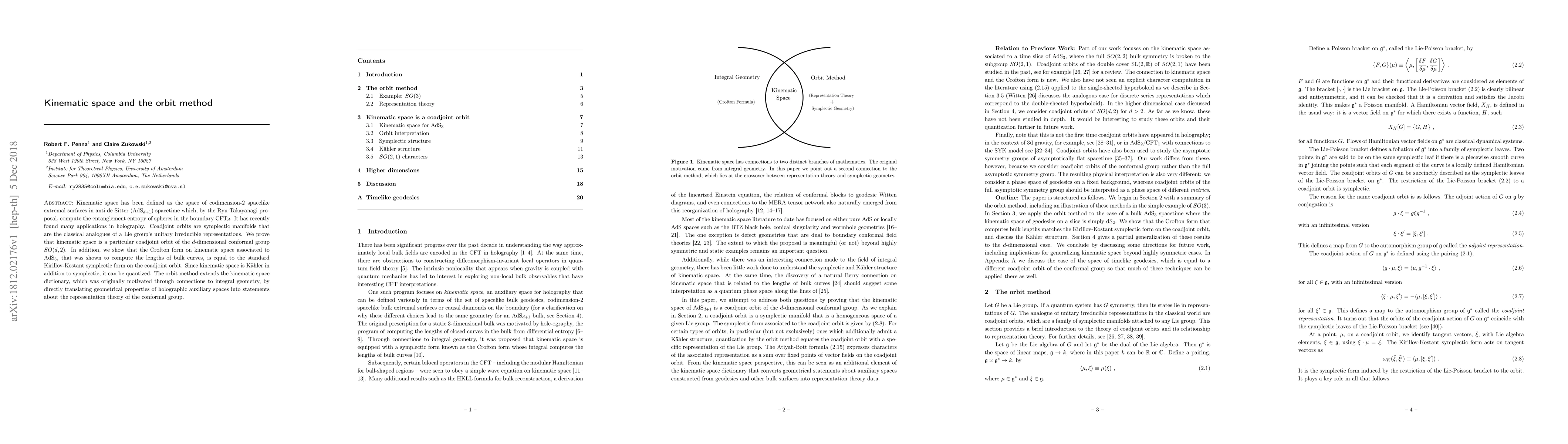 Kinematic space has been defined as the space of codimension-$2$ spacelike extremal surfaces in anti de Sitter (AdS$_{d+1}$) spacetime which, by the Ryu-Takayanagi proposal, compute the entanglement entropy of spheres in the boundary CFT$_d$. It has recently found many applications in holography. Coadjoint orbits are symplectic manifolds that are the classical analogues of a Lie group's unitary irreducible representations. We prove that kinematic space is a particular coadjoint orbit of the $d$-dimensional conformal group $SO(d,2)$. In addition, we show that the Crofton form on kinematic space associated to AdS$_3$, that was shown to compute the lengths of bulk curves, is equal to the standard Kirillov-Kostant symplectic form on the coadjoint orbit. Since kinematic space is K\"{a}hler in addition to symplectic, it can be quantized. The orbit method extends the kinematic space dictionary, which was originally motivated through connections to integral geometry, by directly translating geometrical properties of holographic auxiliary spaces into statements about the representation theory of the conformal group.