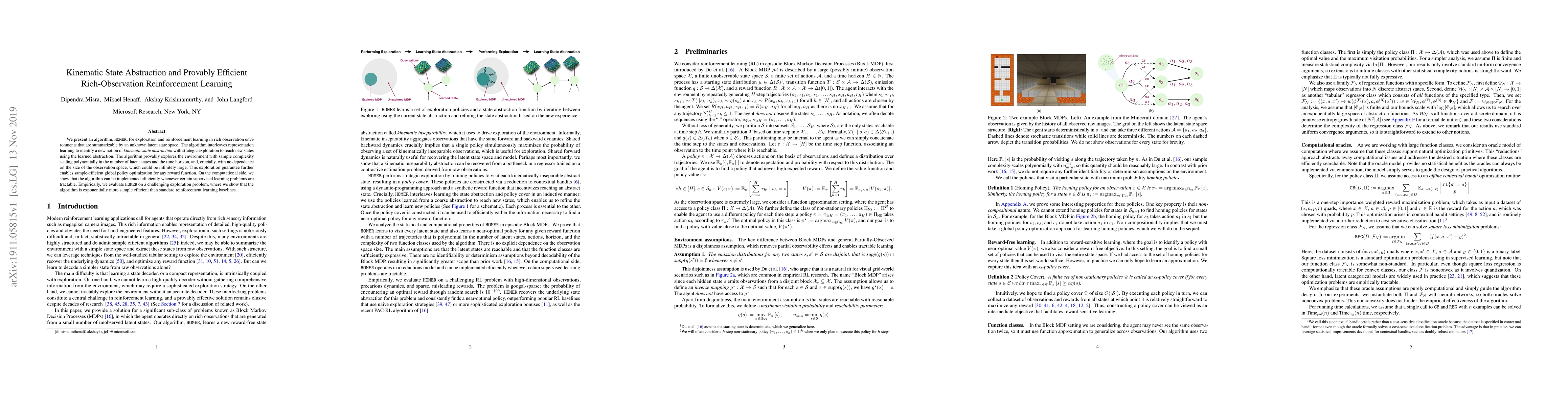 We present an algorithm, HOMER, for exploration and reinforcement learning in rich observation environments that are summarizable by an unknown latent state space. The algorithm interleaves representation learning to identify a new notion of kinematic state abstraction with strategic exploration to reach new states using the learned abstraction. The algorithm provably explores the environment with sample complexity scaling polynomially in the number of latent states and the time horizon, and, crucially, with no dependence on the size of the observation space, which could be infinitely large. This exploration guarantee further enables sample-efficient global policy optimization for any reward function. On the computational side, we show that the algorithm can be implemented efficiently whenever certain supervised learning problems are tractable. Empirically, we evaluate HOMER on a challenging exploration problem, where we show that the algorithm is exponentially more sample efficient than standard reinforcement learning baselines.