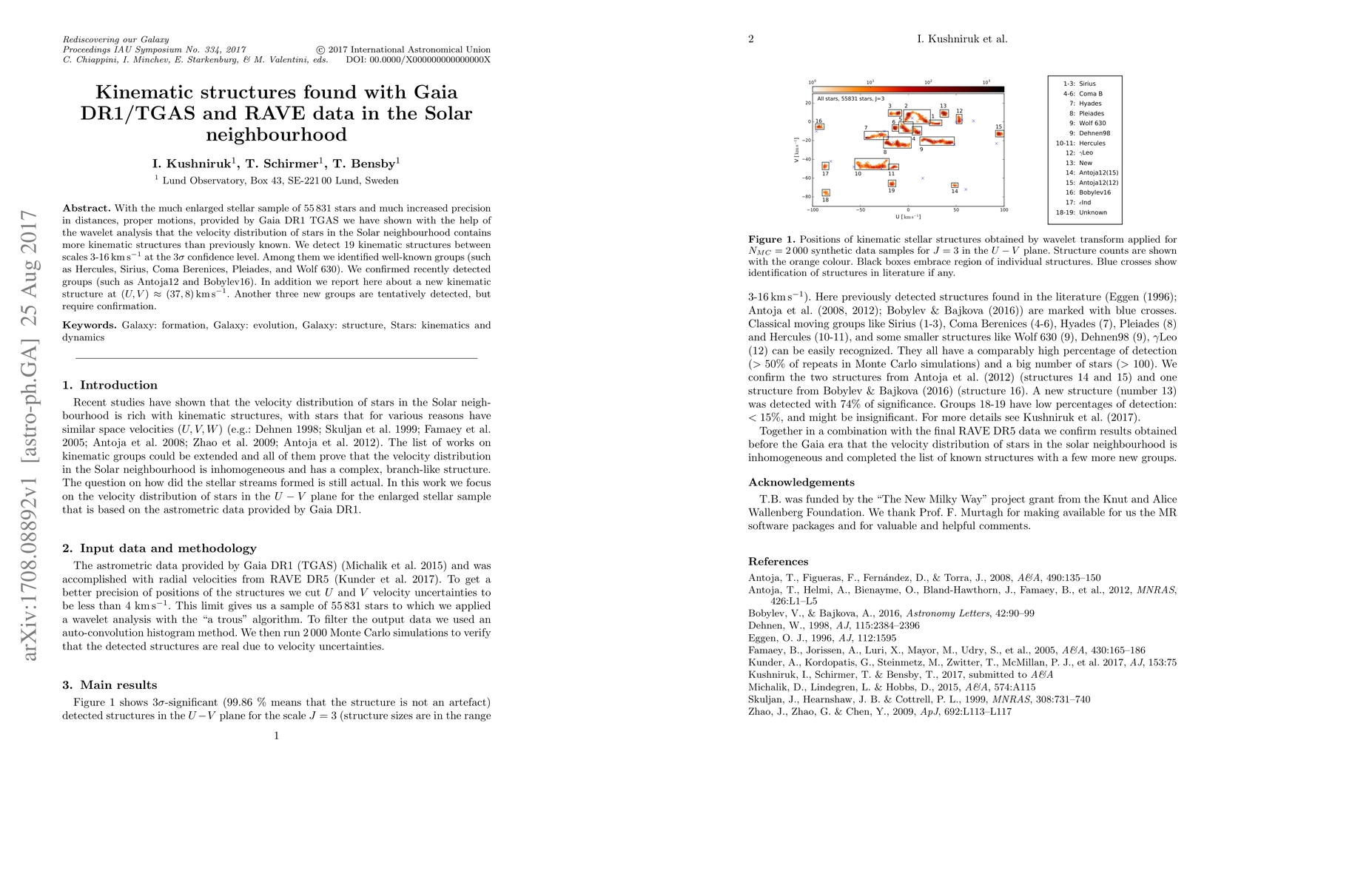This paper uses Gaia DR1 TGAS data to identify 19 kinematic structures in the Solar neighbourhood, including well-known and newly detected groups, with enhanced precision in stellar distances and proper motions. A new kinematic structure at (U,V)=(37, 8) km/s is reported, along with three tentatively detected groups.