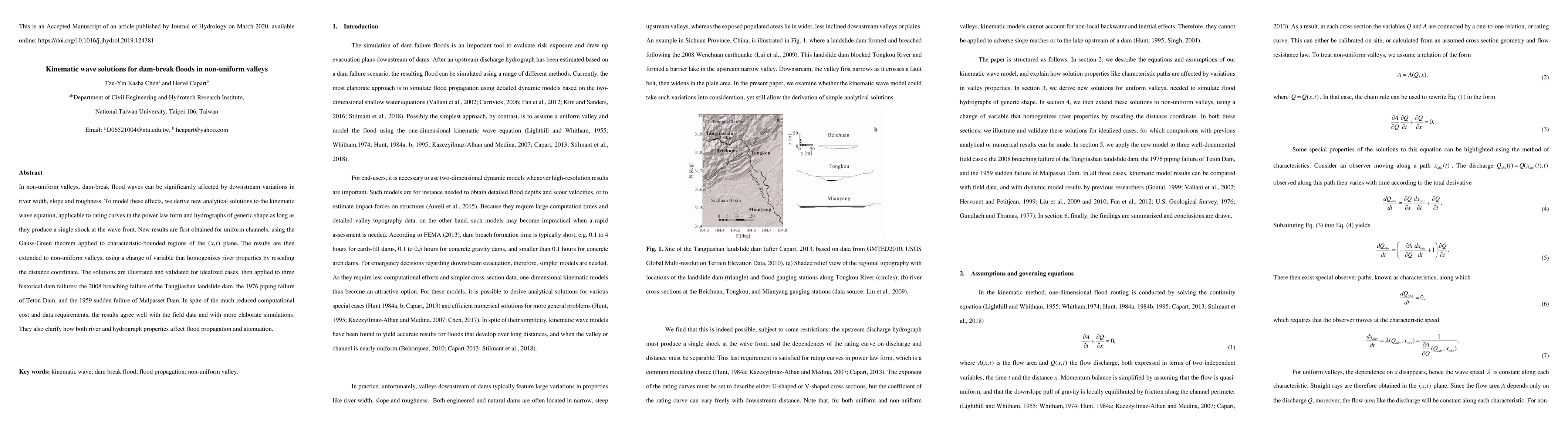 This paper derives new analytical kinematic wave solutions for dam-break floods in non-uniform valleys, showing how variations in river width, slope, and roughness impact flood waves. The solutions, validated against historical dam failures, demonstrate reduced computational costs while maintaining accuracy.