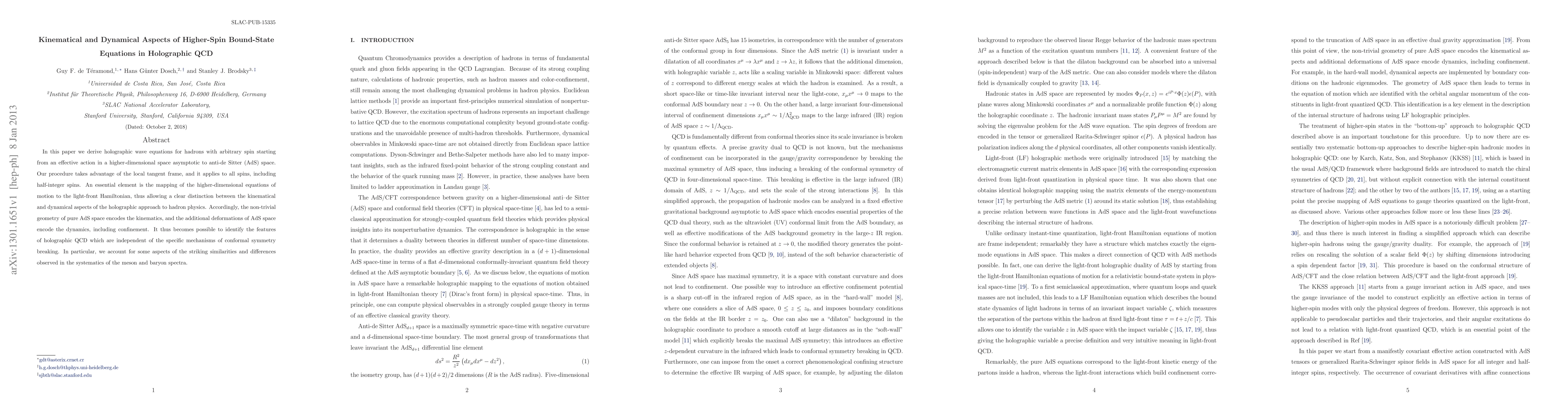 In this paper we derive holographic wave equations for hadrons with arbitrary spin starting from an effective action in a higher-dimensional space asymptotic to anti-de Sitter (AdS) space. Our procedure takes advantage of the local tangent frame, and it applies to all spins, including half-integer spins. An essential element is the mapping of the higher-dimensional equations of motion to the light-front Hamiltonian, thus allowing a clear distinction between the kinematical and dynamical aspects of the holographic approach to hadron physics. Accordingly, the non-trivial geometry of pure AdS space encodes the kinematics, and the additional deformations of AdS space encode the dynamics, including confinement. It thus becomes possible to identify the features of holographic QCD which are independent of the specific mechanisms of conformal symmetry breaking. In particular, we account for some aspects of the striking similarities and differences observed in the systematics of the meson and baryon spectra.