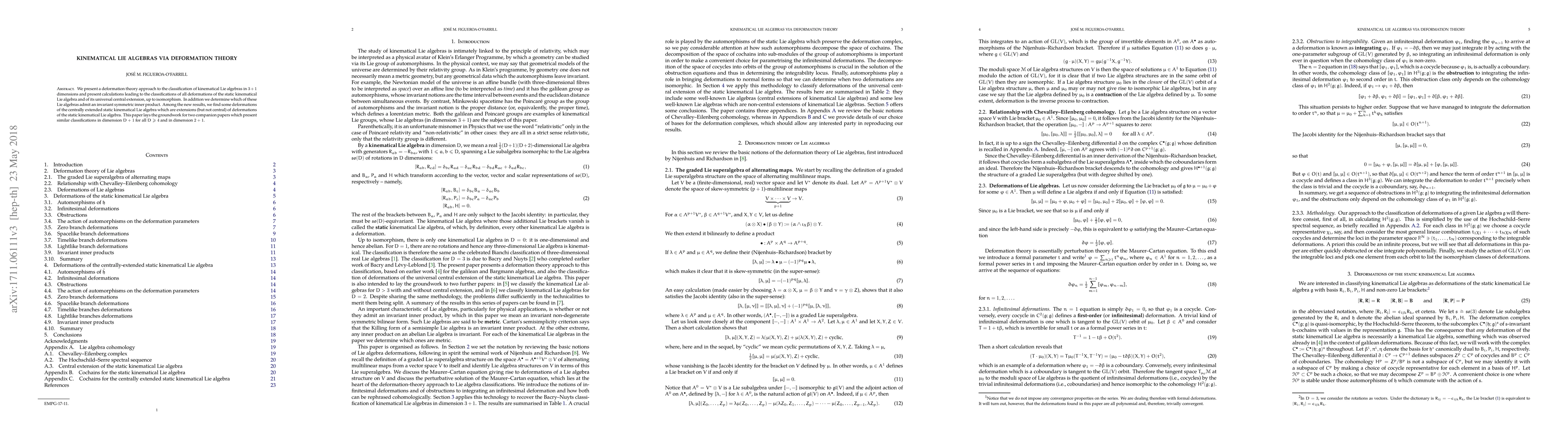 This paper uses deformation theory to classify kinematical Lie algebras in 3+1 dimensions, identifying all deformations of the static kinematical Lie algebra and its universal central extension, and determining which admit invariant symmetric inner products. It also finds non-central extensions and lays the foundation for classifications in higher and lower dimensions.