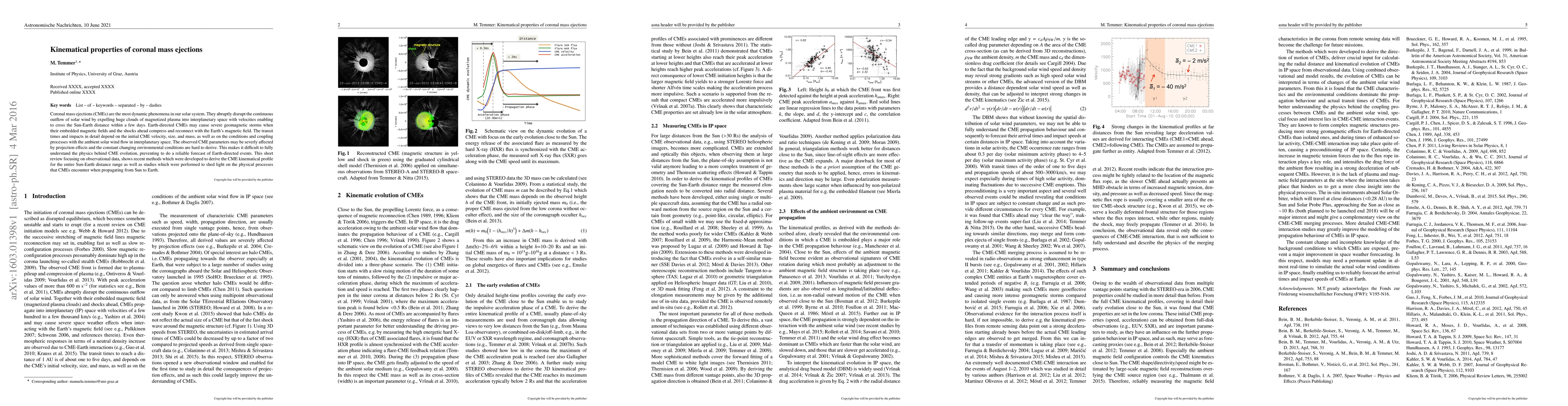 Coronal mass ejections (CMEs) are the most dynamic phenomena in our solar system. They abruptly disrupt the continuous outflow of solar wind by expelling huge clouds of magnetized plasma into interplanetary space with velocities enabling to cross the Sun-Earth distance within a few days. Earth-directed CMEs may cause severe geomagnetic storms when their embedded magnetic fields and the shocks ahead compress and reconnect with the Earth's magnetic field. The transit times and impacts in detail depend on the initial CME velocity, size, and mass, as well as on the conditions and coupling processes with the ambient solar wind flow in interplanetary space. The observed CME parameters may be severly affected by projection effects and the constant changing environmental conditions are hard to derive. This makes it difficult to fully understand the physics behind CME evolution, preventing to do a reliable forecast of Earth-directed events. This short review focusing on observational data, shows recent methods which were developed to derive the CME kinematical profile for the entire Sun-Earth distance range as well as studies which were performed to shed light on the physical processes that CMEs encounter when propagating from Sun to Earth.