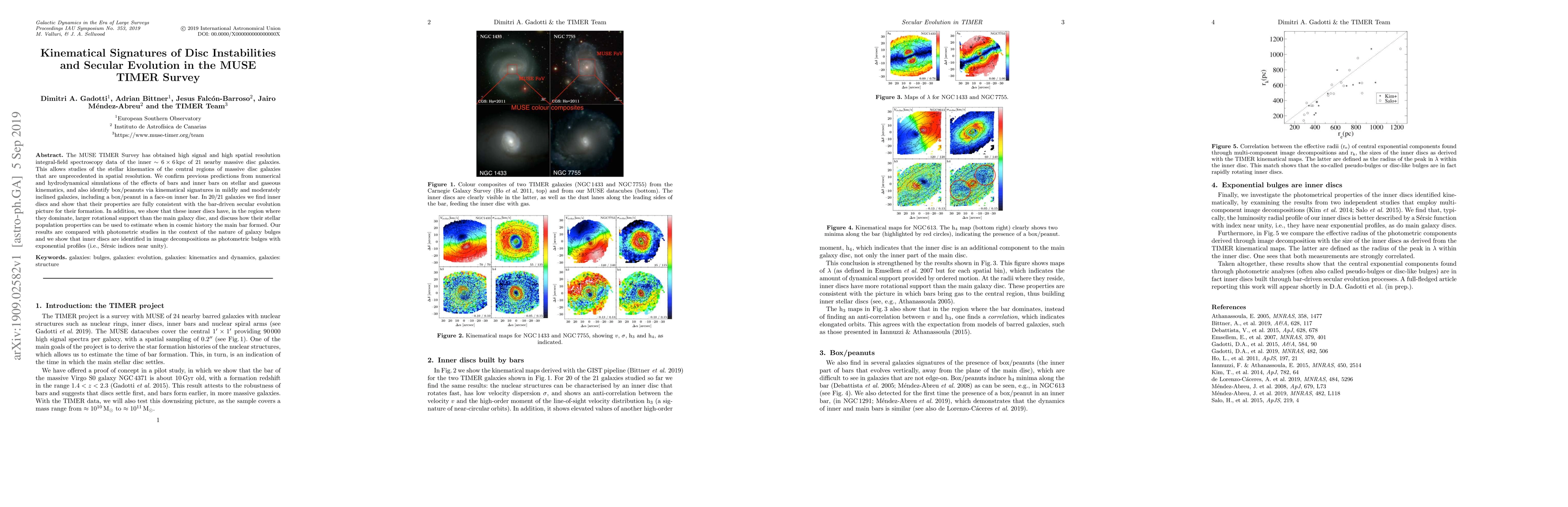 The MUSE TIMER Survey has obtained high signal and high spatial resolution integral-field spectroscopy data of the inner $\sim6\times6$ kpc of 21 nearby massive disc galaxies. This allows studies of the stellar kinematics of the central regions of massive disc galaxies that are unprecedented in spatial resolution. We confirm previous predictions from numerical and hydrodynamical simulations of the effects of bars and inner bars on stellar and gaseous kinematics, and also identify box/peanuts via kinematical signatures in mildly and moderately inclined galaxies, including a box/peanut in a face-on inner bar. In 20/21 galaxies we find inner discs and show that their properties are fully consistent with the bar-driven secular evolution picture for their formation. In addition, we show that these inner discs have, in the region where they dominate, larger rotational support than the main galaxy disc, and discuss how their stellar population properties can be used to estimate when in cosmic history the main bar formed. Our results are compared with photometric studies in the context of the nature of galaxy bulges and we show that inner discs are identified in image decompositions as photometric bulges with exponential profiles (i.e., S\'ersic indices near unity).