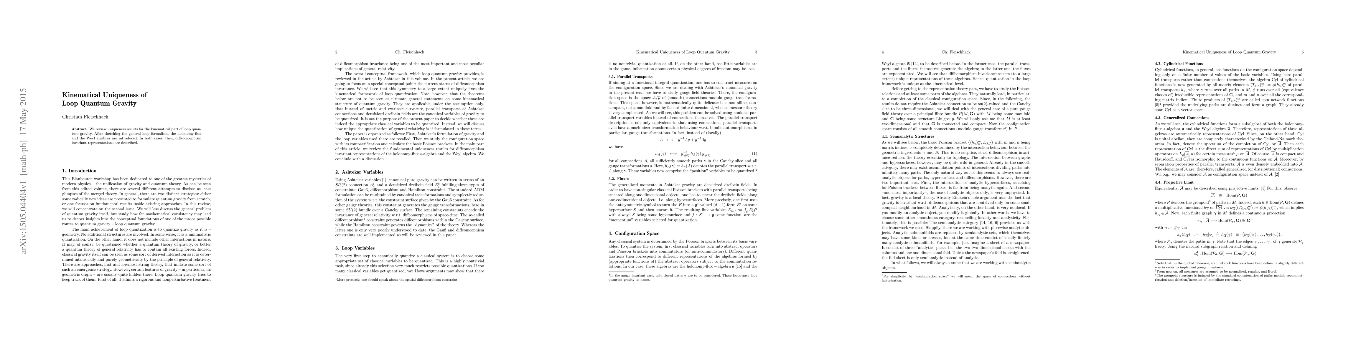 This paper reviews the uniqueness of the kinematical framework in loop quantum gravity, detailing the holonomy-flux and Weyl algebras, and describing their diffeomorphism invariant representations. The focus is on establishing the distinct kinematical structure of loop quantum gravity.