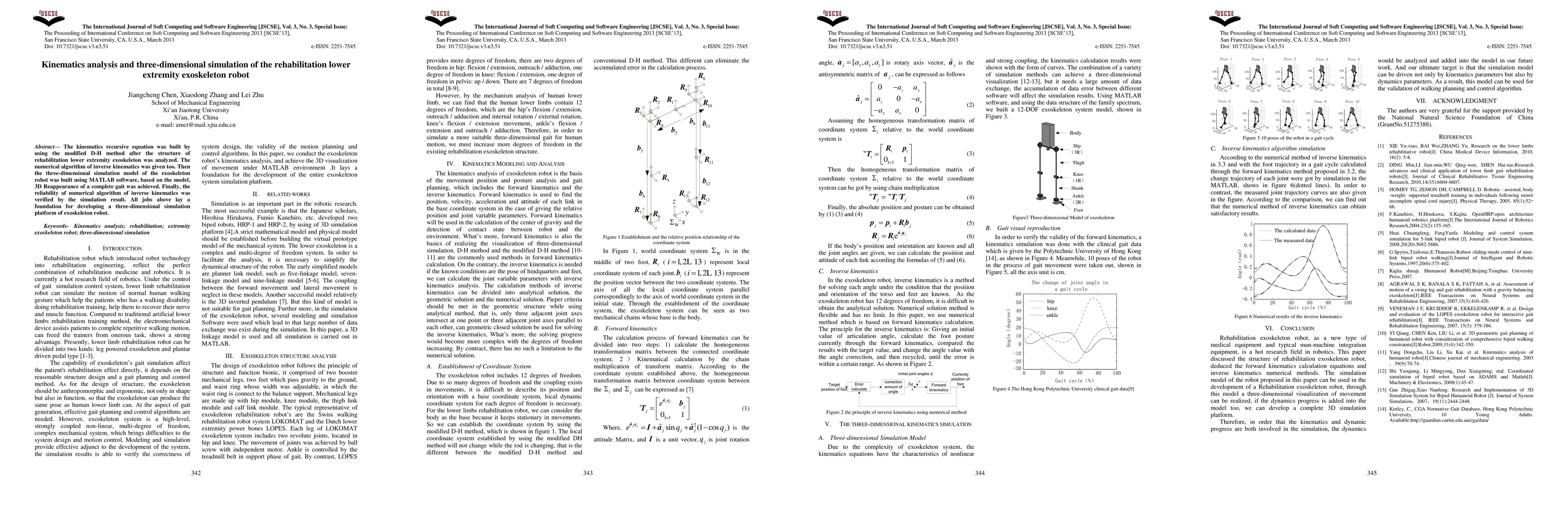 The kinematics recursive equation was built by using the modified D-H method after the structure of rehabilitation lower extremity exoskeleton was analyzed. The numerical algorithm of inverse kinematics was given too. Then the three-dimensional simulation model of the exoskeleton robot was built using MATLAB software, based on the model, 3D reappearance of a complete gait was achieved. Finally, the reliability of numerical algorithm of inverse kinematics was verified by the simulation result. All jobs above lay a foundation for developing a three-dimensional simulation platform of exoskeleton robot.