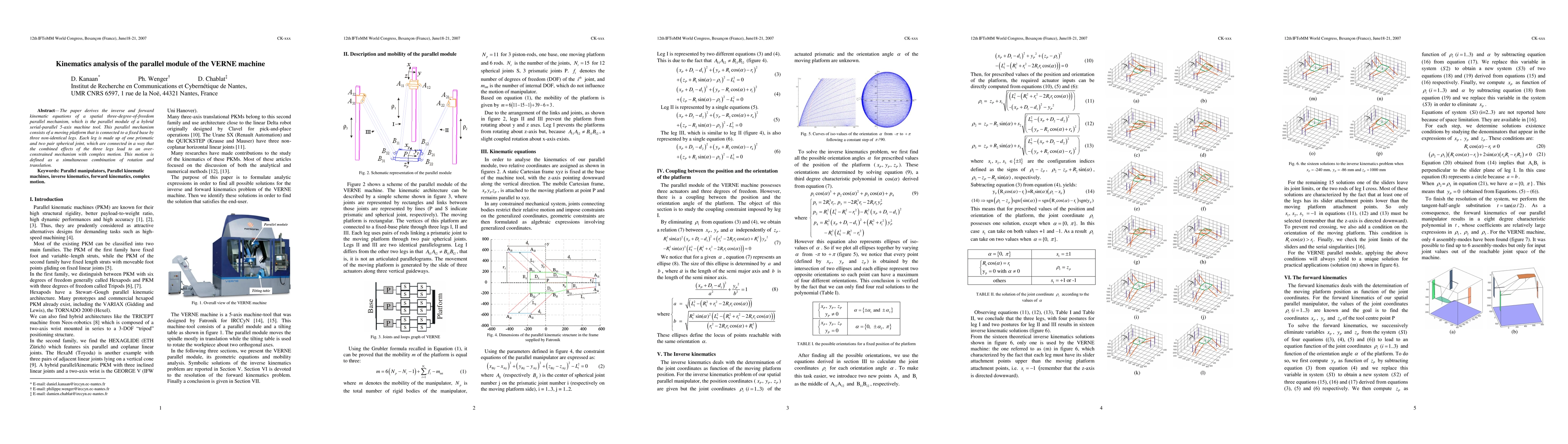 The paper derives the inverse and forward kinematic equations of a spatial three-degree-of-freedom parallel mechanism, which is the parallel module of a hybrid serial-parallel 5-axis machine tool. This parallel mechanism consists of a moving platform that is connected to a fixed base by three non-identical legs. Each leg is made up of one prismatic and two pair spherical joint, which are connected in a way that the combined effects of the three legs lead to an over-constrained mechanism with complex motion. This motion is defined as a simultaneous combination of rotation and translation.