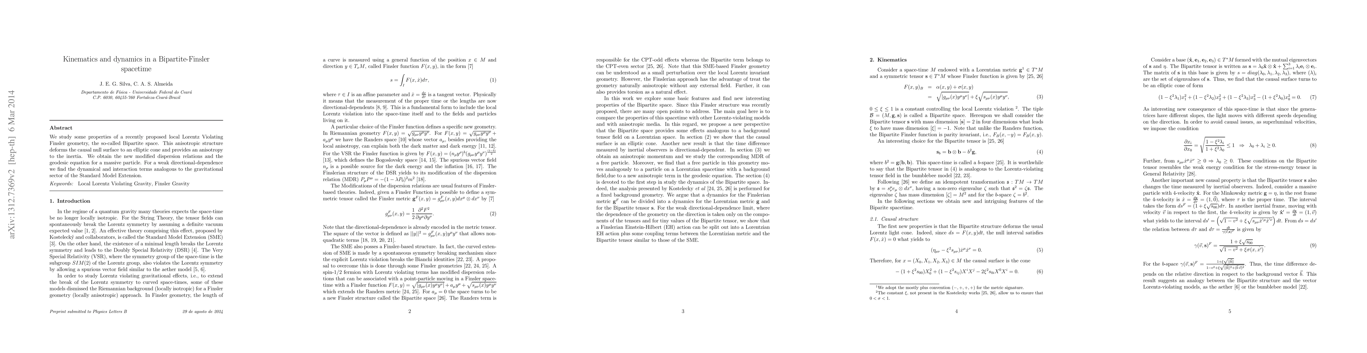 We study some properties of a recently proposed local Lorentz Violating Finsler geometry, the so-called Bipartite space. This anisotropic structure deforms the causal null surface to an elliptic cone and provides an anisotropy to the inertia. The modified dispersion relations and the geodesic equation for a massive particle are studied. For a weak directional-dependence we obtain the dynamical and interaction terms analogous to the gravitational sector of the Standard Model Extension.