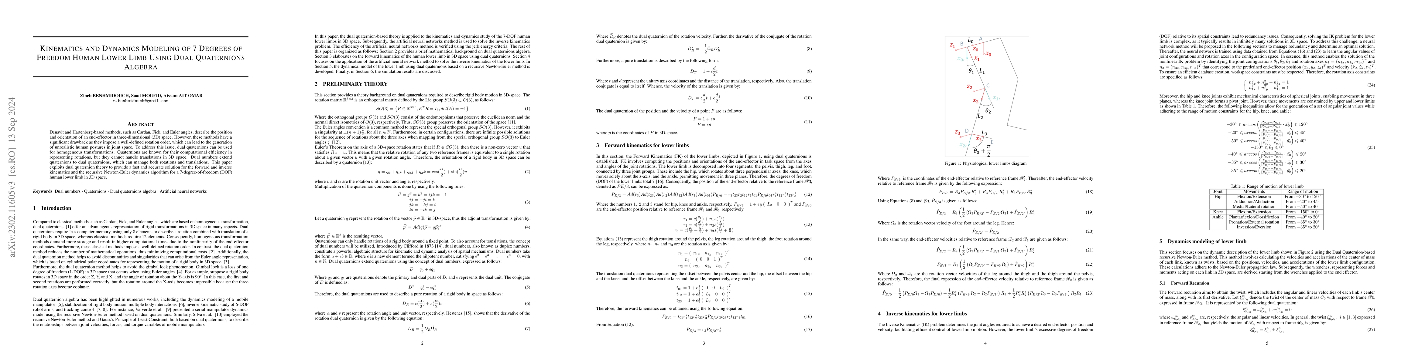 Denavit and Hartenberg based methods as Cardan, Fick and Euler angles describe the position and orientation of an end-effector in Three Dimensional (3D) space. However, the generation of unrealistic human posture in joint space constitutes the weak point to these methods because they impose a well-defined rotations order. A method to handle the transformation homogeneous performance uses the dual quaternions. Quaternions have proven themselves in many fields as providing a computational efficient method to represent a rotation, and yet, they can not deal with the translations in 3D-space. The dual numbers can extend quaternions to dual quaternions. This paper exploits dual quaternions theory to provide a fast and accurate solution to the forward, inverse kinematics and recursive Newton-Euler dynamics algorithm for 7 Degree of Freedom (DOF) human lower limb in 3D-space.