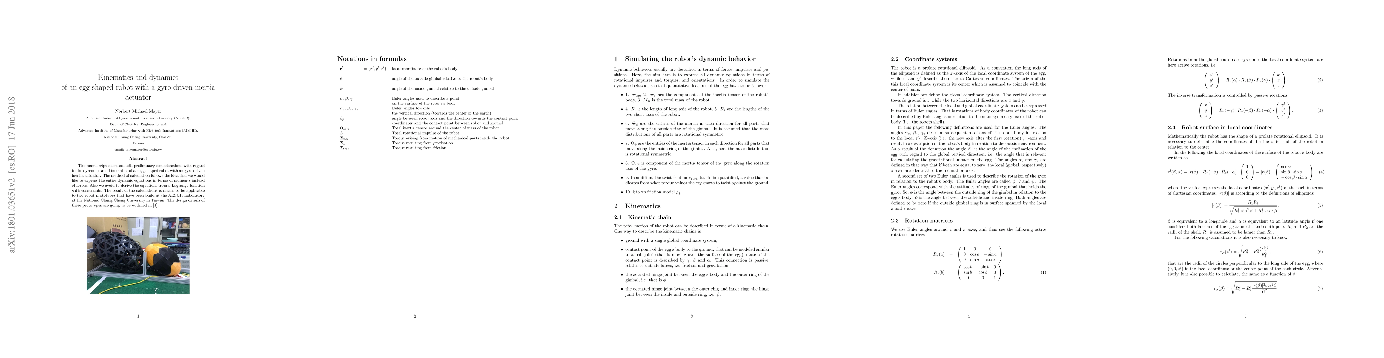 The manuscript discusses still preliminary considerations with regard to the dynamics and kinematics of an egg shaped robot with an gyro driven inertia actuator. The method of calculation follows the idea that we would like to express the entire dynamic equations in terms of moments instead of forces. Also we avoid to derive the equations from a Lagrange function with constraints. The result of the calculations is meant to be applicable to two robot prototypes that have been build at the AES\&R Laboratory at the National Chung Cheng University in Taiwan.