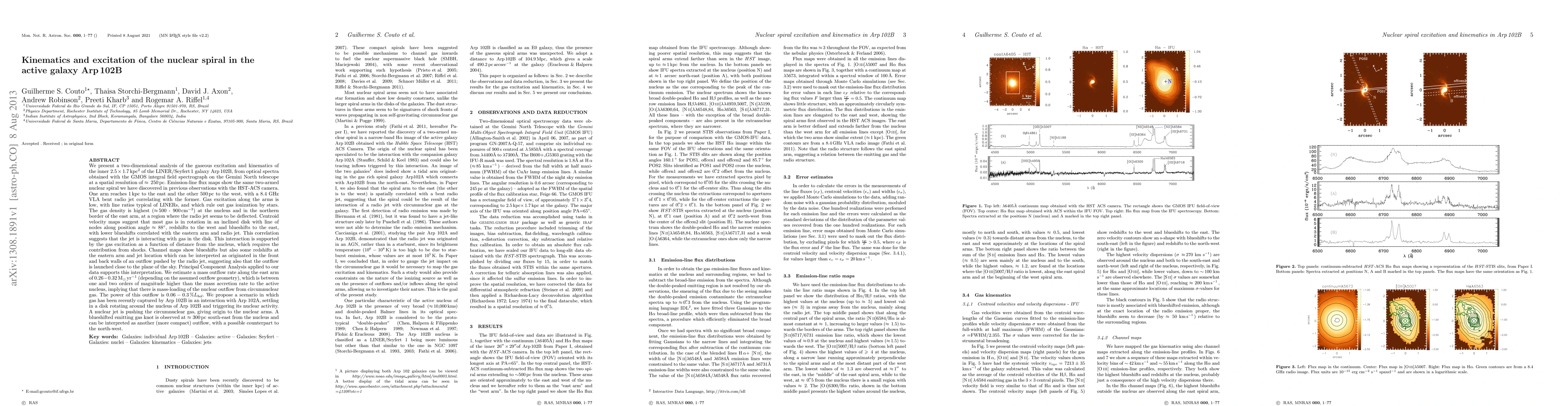 We present a two-dimensional analysis of the gaseous excitation and kinematics of the inner 2.5 x 1.7 kpc^2 of the LINER/Seyfert 1 galaxy Arp 102B, from optical spectra obtained with the GMOS integral field spectrograph on the Gemini North telescope at a spatial resolution of 250 pc. Emission-line flux maps show the same two-armed nuclear spiral we have discovered in previous observations with the HST-ACS camera. One arm reaches 1 kpc to the east and the other 500 pc to the west, with a 8.4 GHz VLA bent radio jet correlating with the former. The gas density is highest (500 - 900 cm^(-3)) at the nucleus and in the northern border of the east arm, at a region where the radio jet seems to be deflected. Channel maps show blueshifts but also some redshifts at the eastern arm and jet location which can be interpreted as originated in the front and back walls of an outflow pushed by the radio jet, suggesting also that the outflow is launched close to the plane of the sky. We estimate a mass outflow rate along the east arm of 0.26 - 0.32 Msun yr^(-1) (depending on the assumed outflow geometry), which is between one and two orders of magnitude higher than the mass accretion rate to the active nucleus, implying that there is mass-loading of the nuclear outflow from circumnuclear gas. The power of this outflow is 0.06 - 0.3%Lbol. We propose a scenario in which gas has been recently captured by Arp 102B in an interaction with Arp 102A, settling in a disk rotating around the nucleus of Arp 102B and triggering its nuclear activity. A nuclear jet is pushing the circumnuclear gas, giving origin to the nuclear arms. A blueshifted emitting gas knot is observed at 300 pc south-east from the nucleus and can be interpreted as another (more compact) outflow, with a possible counterpart to the north-west.