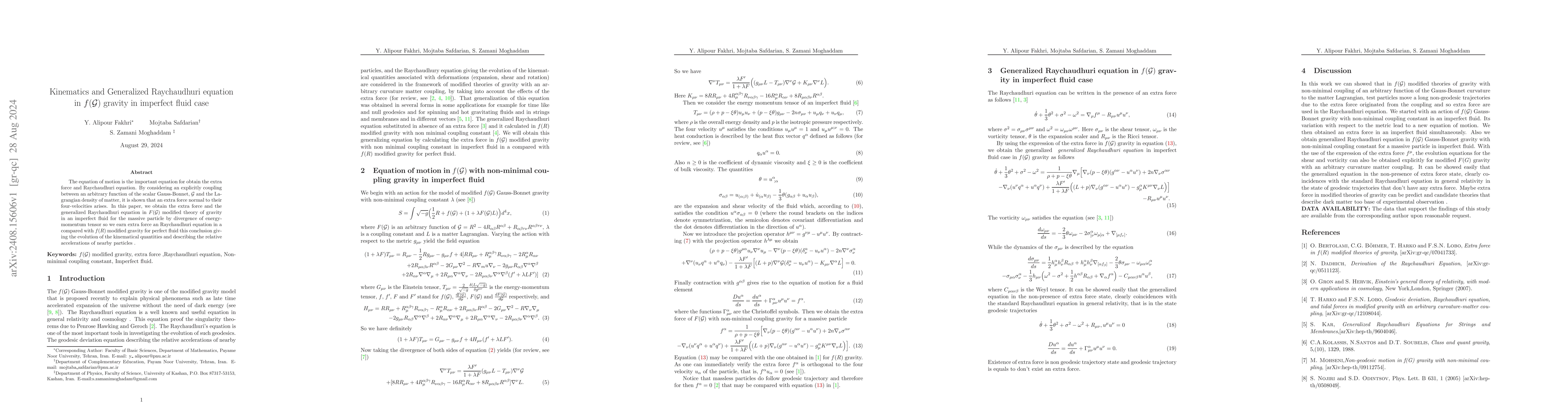 This paper investigates the kinematics and generalized Raychaudhuri equation in f(G) gravity, showing an extra force arises due to an explicit coupling between an arbitrary function of the scalar Gauss-Bonnet and the matter Lagrangian density. It derives these effects for an imperfect fluid, providing insights into the evolution of kinematical quantities and relative accelerations of nearby particles.