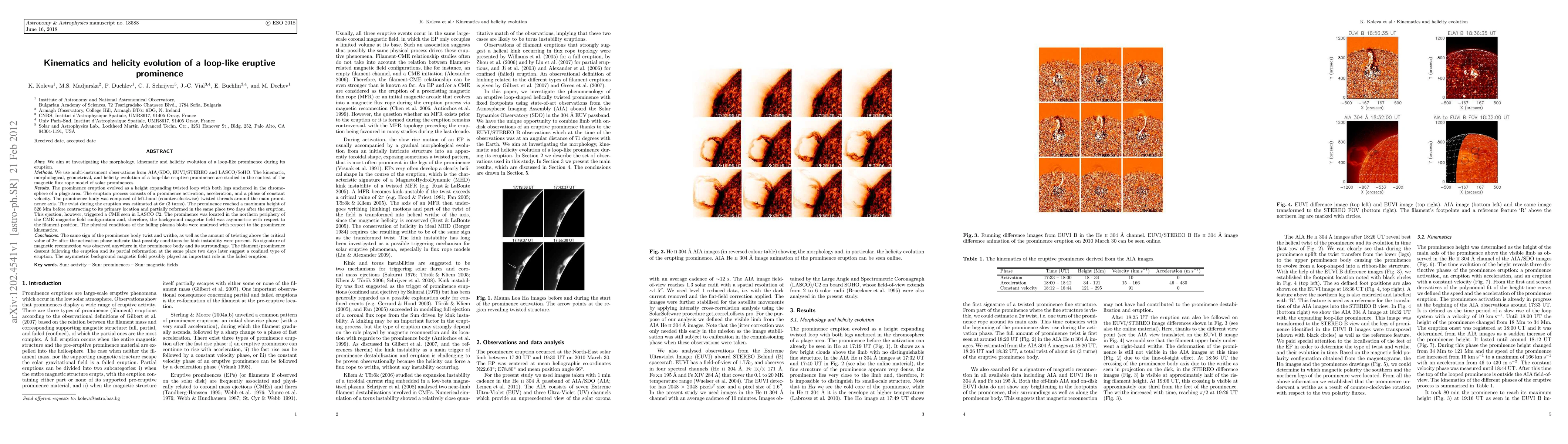 This study investigates the kinematics, morphology, and helicity of a loop-like eruptive solar prominence using multi-instrument observations. The prominence exhibited a left-hand twist and reached a maximum height of 526 Mm before partial reformation, suggesting a confined eruption with no magnetic reconnection, and indicating a possible kink instability.