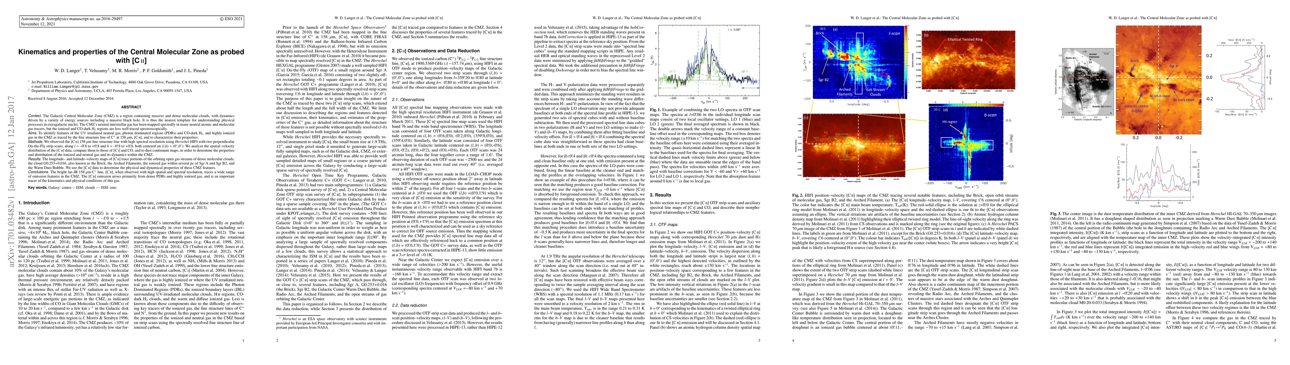 This paper investigates the Central Molecular Zone (CMZ) using high-resolution [C II] 158-micron observations to map ionized gas features, including UV irradiated regions and photon dominated regions. The study reveals the kinematics and dynamics of dense molecular clouds and ionized gas streams, providing insights into the physical conditions of the CMZ.