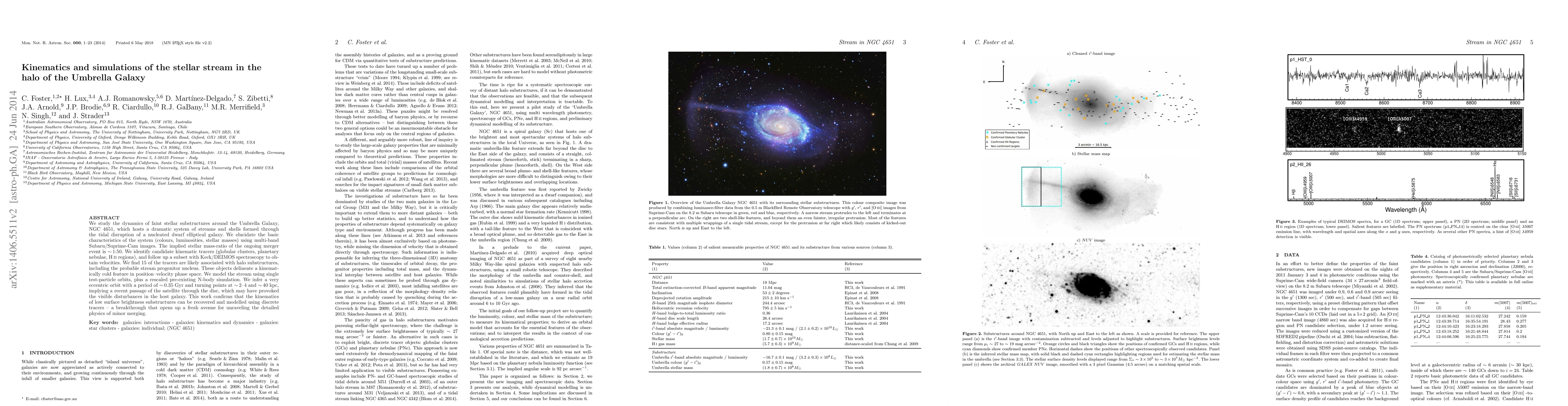 We study the dynamics of faint stellar substructures around the Umbrella Galaxy, NGC 4651, which hosts a dramatic system of streams and shells formed through the tidal disruption of a nucleated dwarf elliptical galaxy. We elucidate the basic characteristics of the system (colours, luminosities, stellar masses) using multi-band Subaru/Suprime-Cam images. The implied stellar mass-ratio of the ongoing merger event is about 1:50. We identify candidate kinematic tracers (globular clusters, planetary nebulae, H ii regions), and follow up a subset with Keck/DEIMOS spectroscopy to obtain velocities. We find that 15 of the tracers are likely associated with halo substructures, including the probable stream progenitor nucleus. These objects delineate a kinematically cold feature in position-velocity phase space. We model the stream using single test-particle orbits, plus a rescaled pre-existing N-body simulation. We infer a very eccentric orbit with a period of roughly 0.35 Gyr and turning points at approximately 2-4 and 40 kpc, implying a recent passage of the satellite through the disc, which may have provoked the visible disturbances in the host galaxy. This work confirms that the kinematics of low surface brightness substructures can be recovered and modeled using discrete tracers - a breakthrough that opens up a fresh avenue for unraveling the detailed physics of minor merging.