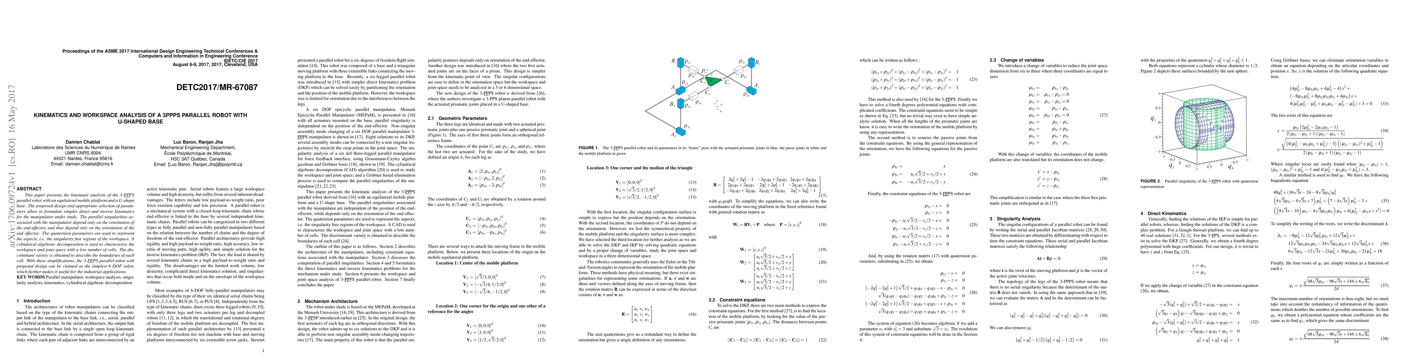 This paper analyzes the kinematics of a 3-PPPS parallel robot with a U-shaped base and equilateral mobile platform, simplifying direct and inverse kinematics. The workspace is characterized using quaternion parameters and cylindrical algebraic decomposition, making it a simple yet effective 6 DOF robot for industrial applications.