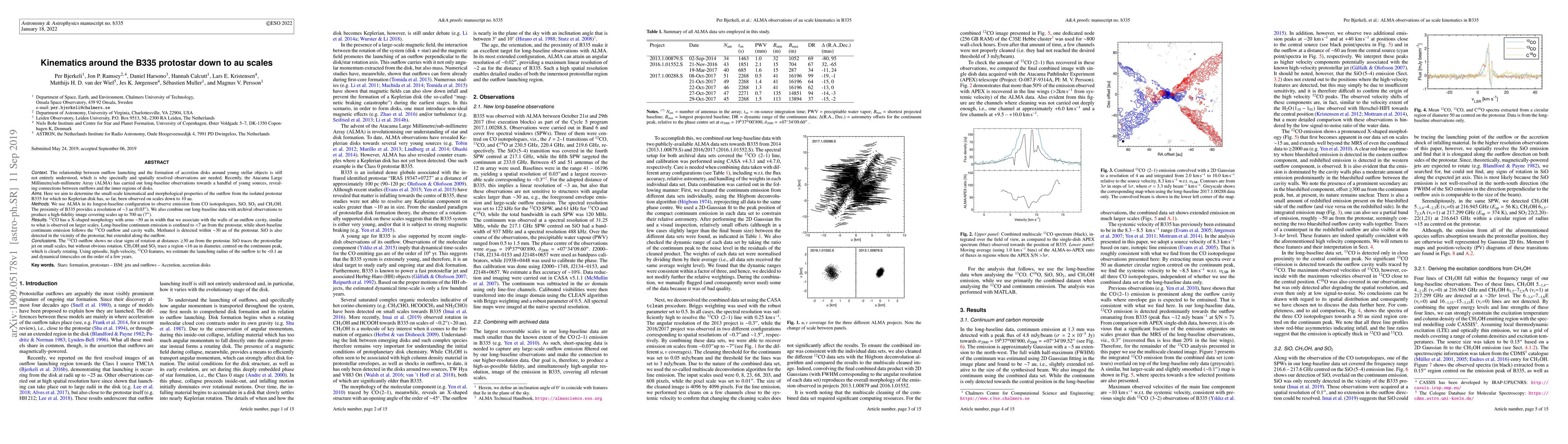 This study uses ALMA to investigate the kinematics and morphology of the outflow from the protostar B335, revealing an X-shaped CO outflow and a rotating region traced by CH$_3$OH and SO$_2$ within ~16 au. The outflow launching radius is estimated to be <0.1 au, with dynamical timescales of a few years.