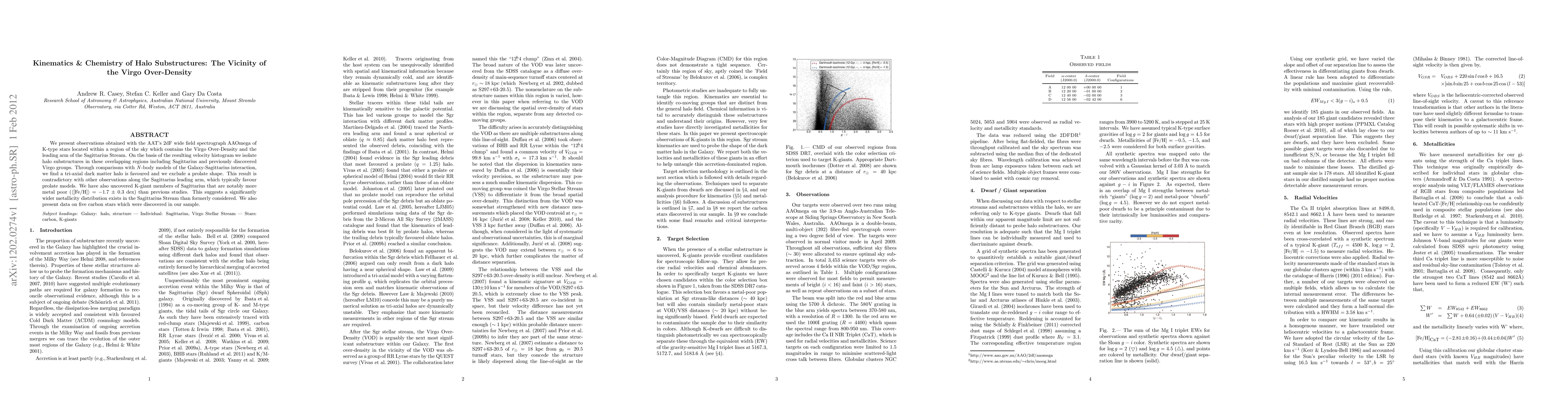 We present observations obtained with the AAT's 2dF wide field spectrograph AAOmega of K-type stars located within a region of the sky which contains the Virgo Over-Density and the leading arm of the Sagittarius Stream. On the basis of the resulting velocity histogram we isolate halo substructures in these overlapping regions including Sagittarius and previously discovered Virgo groups. Through comparisons with N-body models of the Galaxy-Sagittarius interaction, we find a tri-axial dark matter halo is favoured and we exclude a prolate shape. This result is contradictory with other observations along the Sagittarius leading arm, which typically favour prolate models. We have also uncovered K-giant members of Sagittarius that are notably more metal poor ([Fe/H] = -1.7 +/- 0.3 dex) than previous studies. This suggests a significantly wider metallicity distribution exists in the Sagittarius Stream than formerly considered. We also present data on five carbon stars which were discovered in our sample.