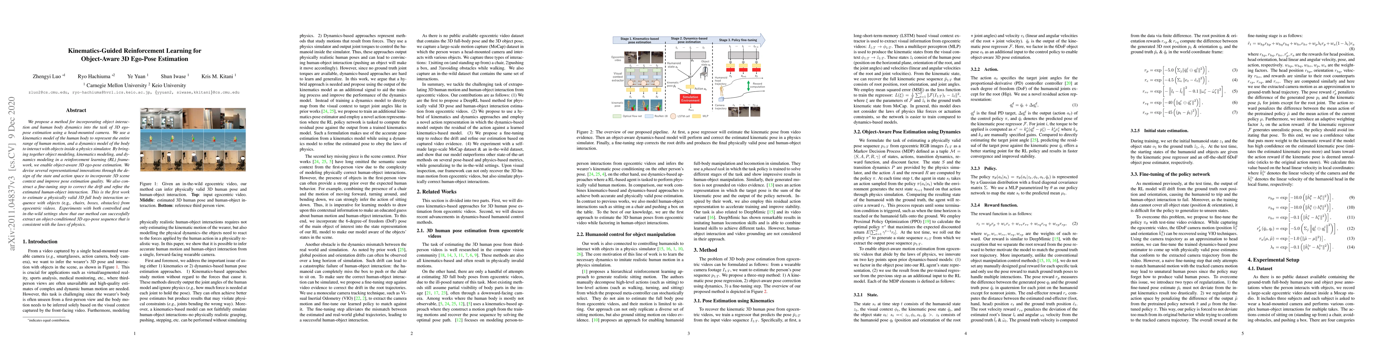 This paper introduces a reinforcement learning approach that integrates kinematics and dynamics models to enhance 3D ego-pose estimation from head-mounted camera feeds, incorporating object interactions and human body dynamics. The method achieves accurate, physically valid 3D full-body interaction sequences with objects, validated through experiments in both controlled and real-world environments.