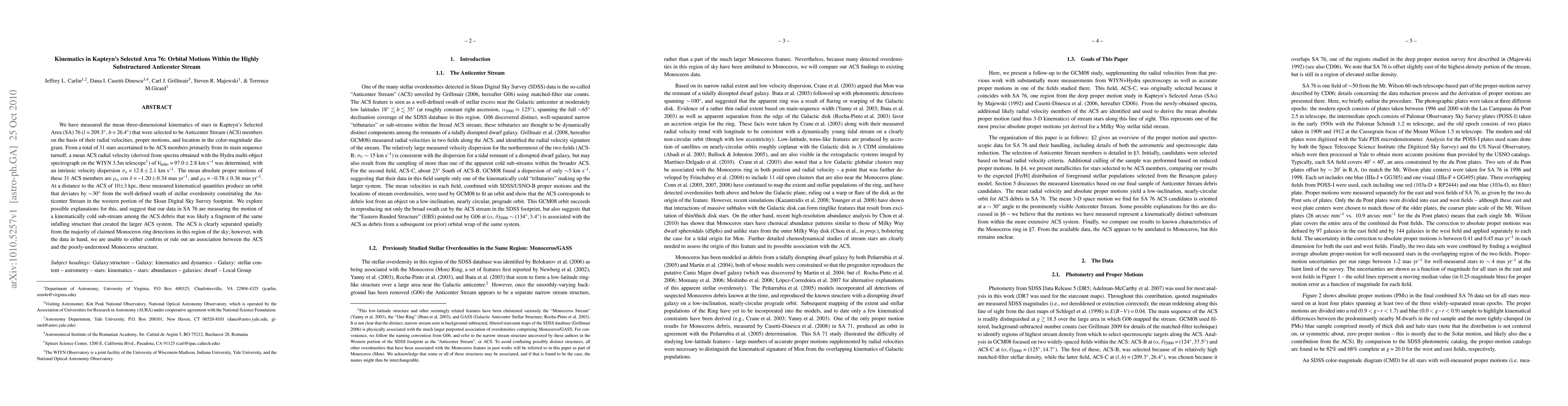 We have measured the mean three-dimensional kinematics of stars in Kapteyn's Selected Area (SA) 76 (l=209.3, b=26.4 degrees) that were selected to be Anticenter Stream (ACS) members on the basis of their radial velocities, proper motions, and location in the color-magnitude diagram. From a total of 31 stars ascertained to be ACS members primarily from its main sequence turnoff, a mean ACS radial velocity (derived from spectra obtained with the Hydra multi-object spectrograph on the WIYN 3.5m telescope) of V_helio = 97.0 +/- 2.8 km/s was determined, with an intrinsic velocity dispersion sigma_0 = 12.8 \pm 2.1 km/s. The mean absolute proper motions of these 31 ACS members are mu_alpha cos (delta) = -1.20 +/- 0.34 mas/yr and mu_delta = -0.78 \pm 0.36 mas/yr. At a distance to the ACS of 10 \pm 3 kpc, these measured kinematical quantities produce an orbit that deviates by ~30 degrees from the well-defined swath of stellar overdensity constituting the Anticenter Stream in the western portion of the Sloan Digital Sky Survey footprint. We explore possible explanations for this, and suggest that our data in SA 76 are measuring the motion of a kinematically cold sub-stream among the ACS debris that was likely a fragment of the same infalling structure that created the larger ACS system. The ACS is clearly separated spatially from the majority of claimed Monoceros ring detections in this region of the sky; however, with the data in hand, we are unable to either confirm or rule out an association between the ACS and the poorly-understood Monoceros structure.